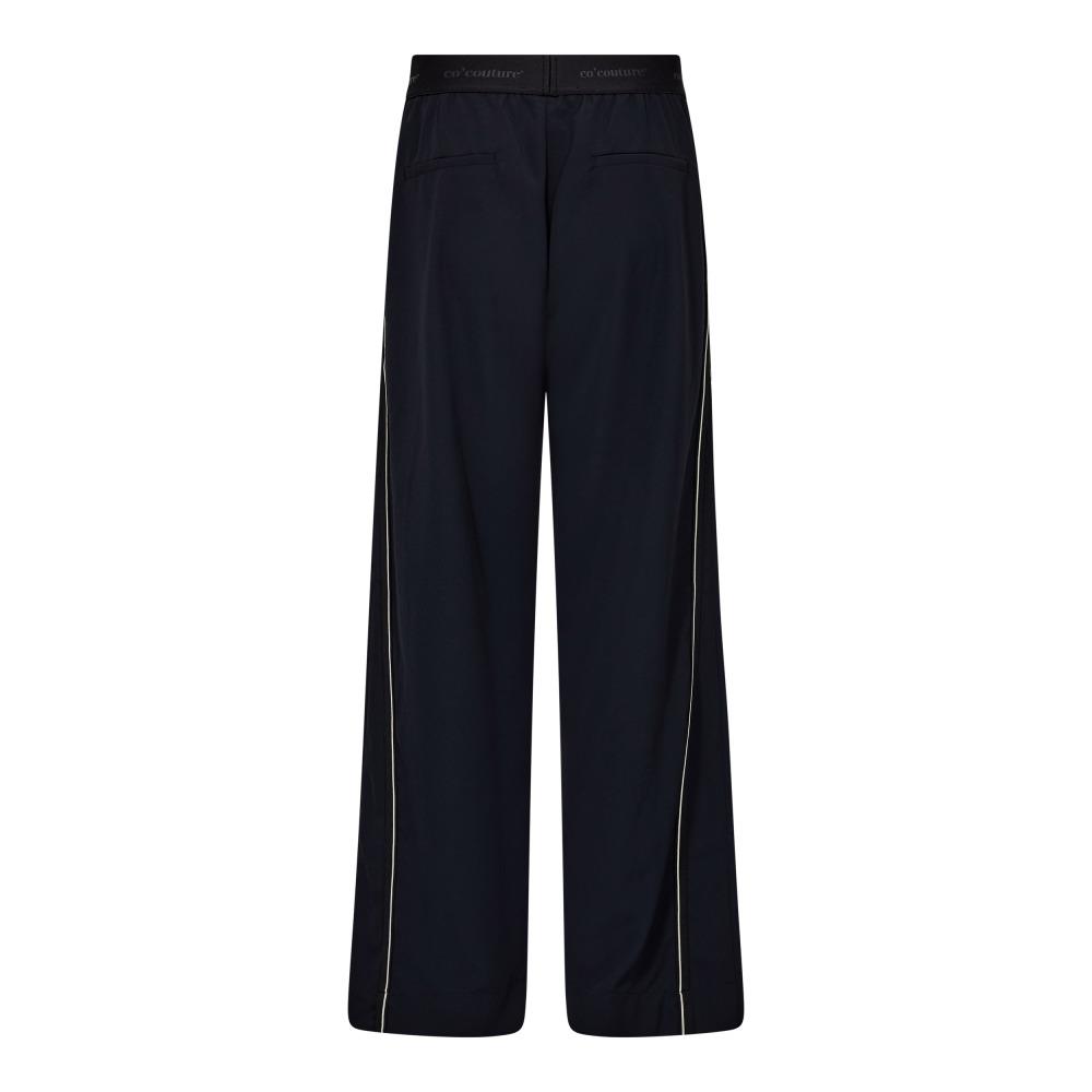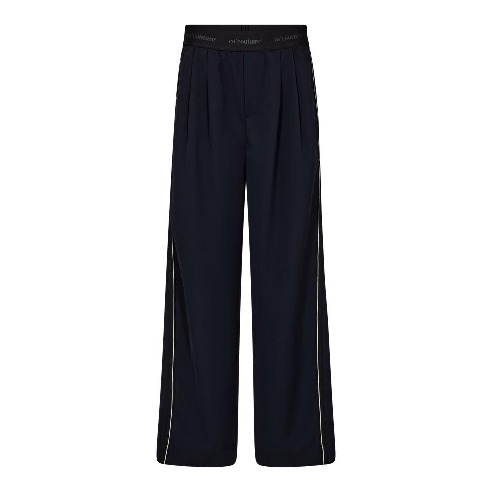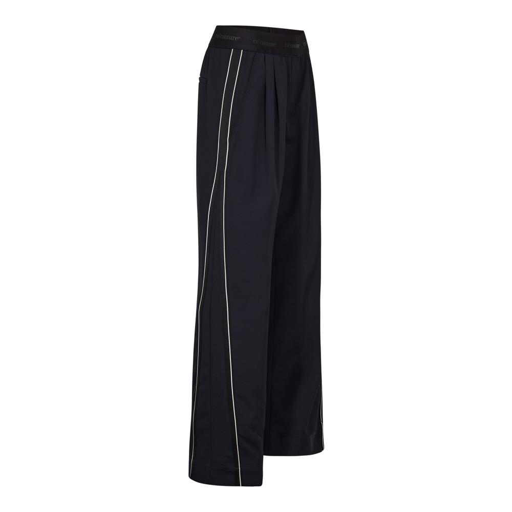 Så cool bukser fra Co' Couture i helt mørk navy med fine panel detaljer i råhvid og sort ned af siderne, som giver et virkelig flot udtryk. Amina Logo Panel Pant har elastikkant i taljen med logoskrift, lommer i siderne samt paspolerede lommer bagpå, læg detaljer fortil og lange løse benlængder. Bukserne har et løst og behageligt fit, som er nem at style. En virkelig trendy style, der helt klart bliver et musthave i garderoben.