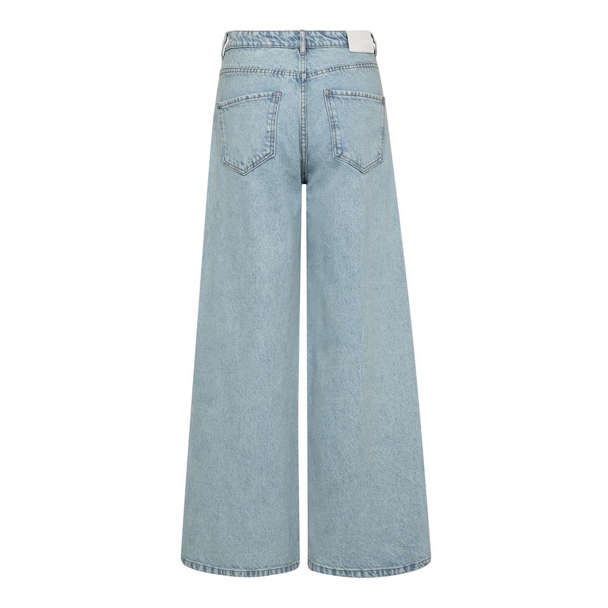 Sejeste jeans fra Co'Couture i lys slidt denim. Arona Wide Jeans er med høj talje og lukkes med lynlås og knap og har bæltestropper i taljen. Jeansene er med lommer i siderne, baglommer og har ben med meget vidde og cool syningsdetaljer på benene, som giver en virkelig cool effekt. Der findes matchende bomberjakke til, hvis du vil fuldende looket for et virkelig cool sæt.