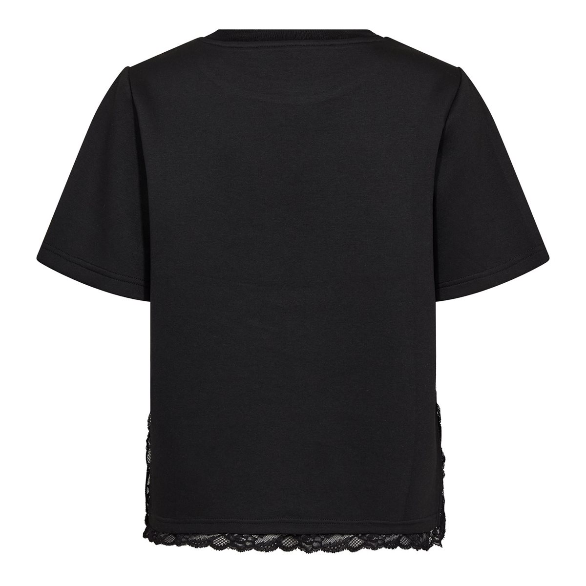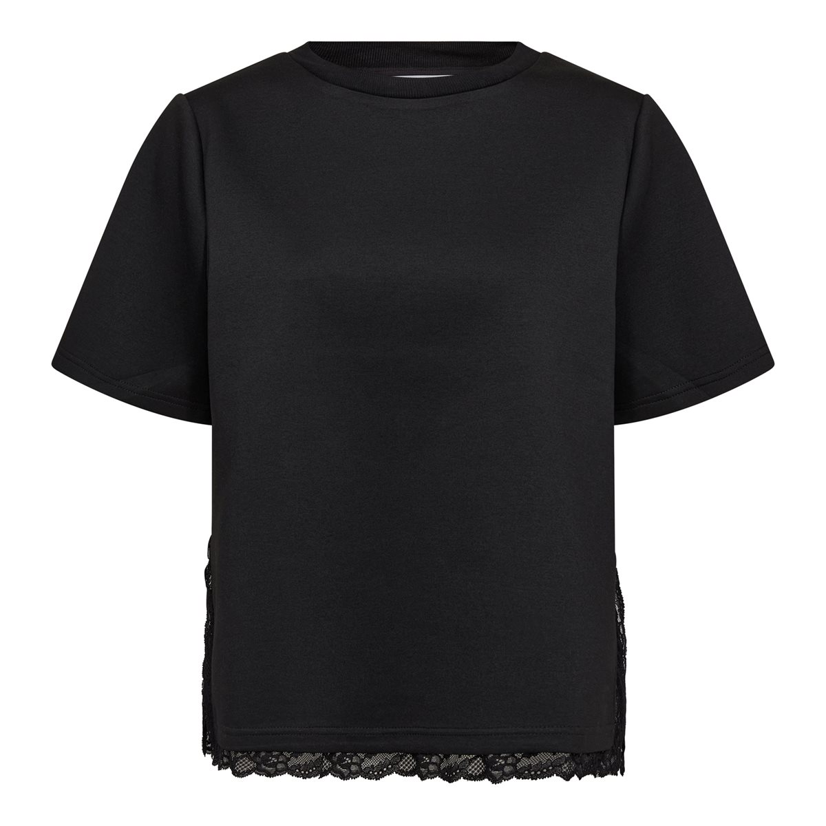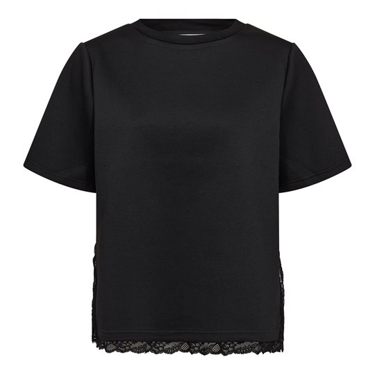 Så lækker og blød t-shirt i en sweatlingende kvalitet med blondedetaljer forneden. Evi Lace Tee i sort har alm. t-shirt pasform med rund hals og korte ærmer. Forneden har t-shirten en lille slids i begge sider, hvor der hele vejen rundt i kanten er påsyet en fin blondekant. Virkelig en fin og unik t-shirt, som kan bruge for sig selv, eller som giver en flot effekt under dine strik og bluser.