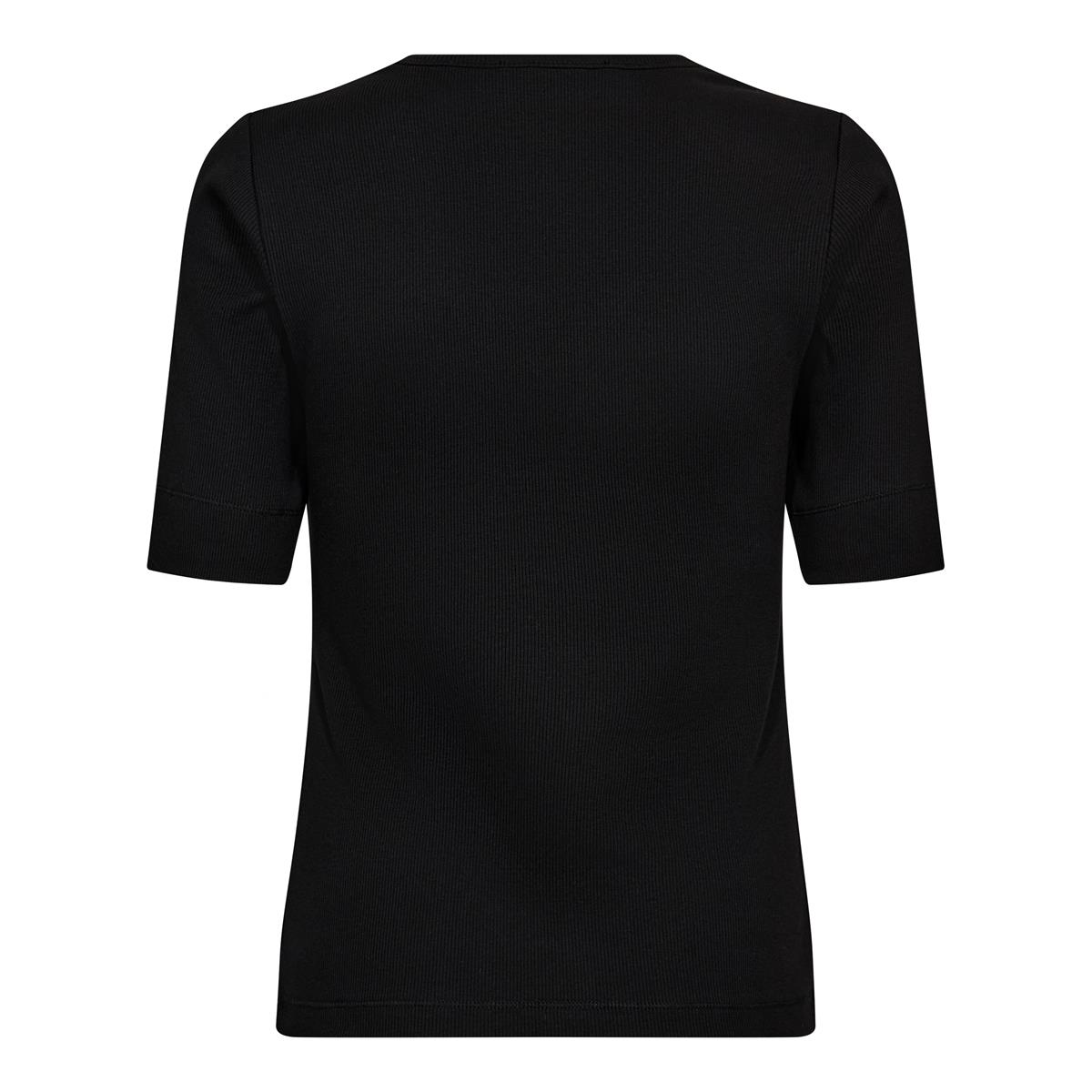 Virkelig lækker basic t-shirt fra Co' Couture i sort. Granny Rib SS V-Tee har v-udskæring, er med en forholdsvis tætsiddende pasform og en virkelig god ærmelængde, der skjuler overarmene. T-Shirten er i en lækker blød økologisk bomuldskvalitet og er perfekt til basisgarderoben.