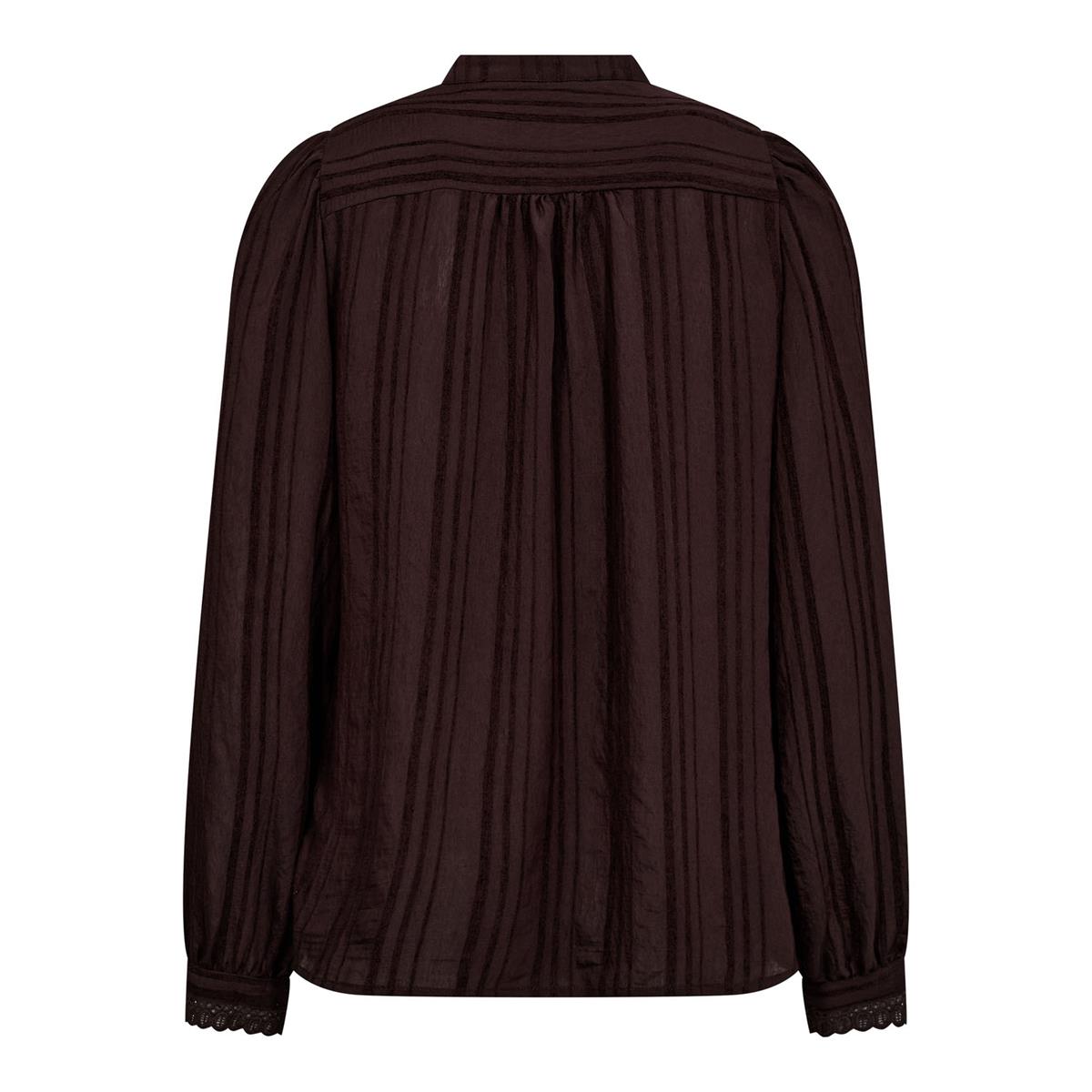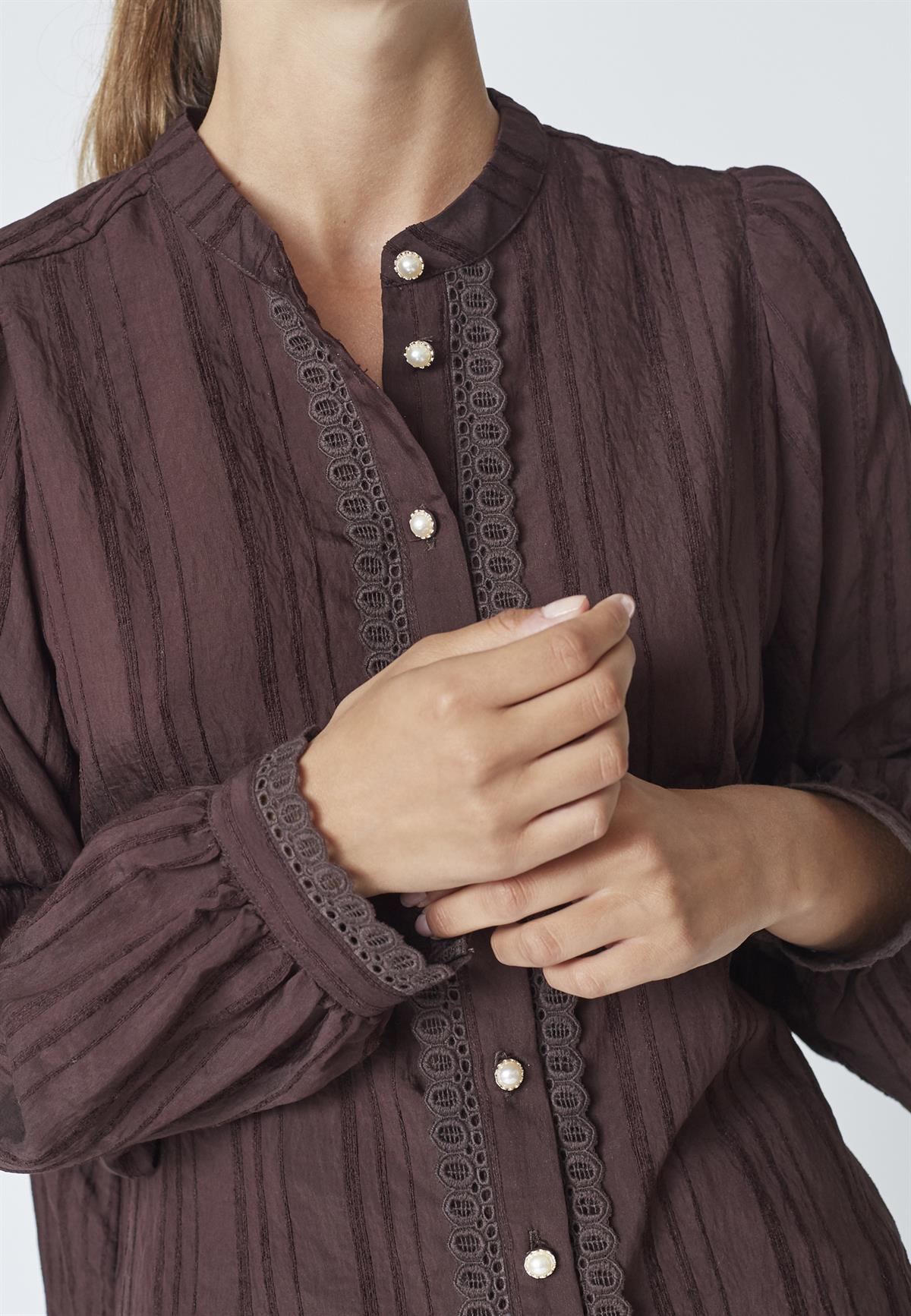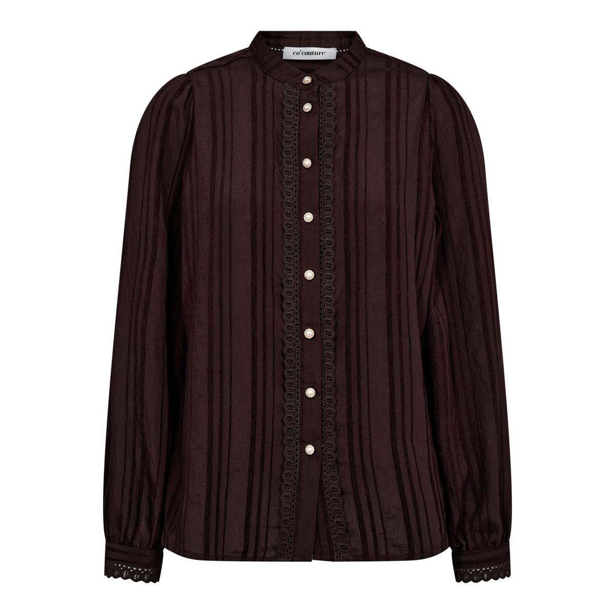 Så fin og feminin skjortebluse fra Co' Couture i mørkebrun med virkelig fine detaljer. Kesi Lace Shirt er med rund hals og lange ærmer med knaplukning ved håndled og den fineste blondeafslutning. Skjorten er gennemknappet med de fineste "guldknapper med perlemors detaljer og har blondebåndsdetaljer ned foran langs knaplukningen og har let puf ved skulderpartiet. En virkelig elegant bluse med et tidløst design. Er let transparent.