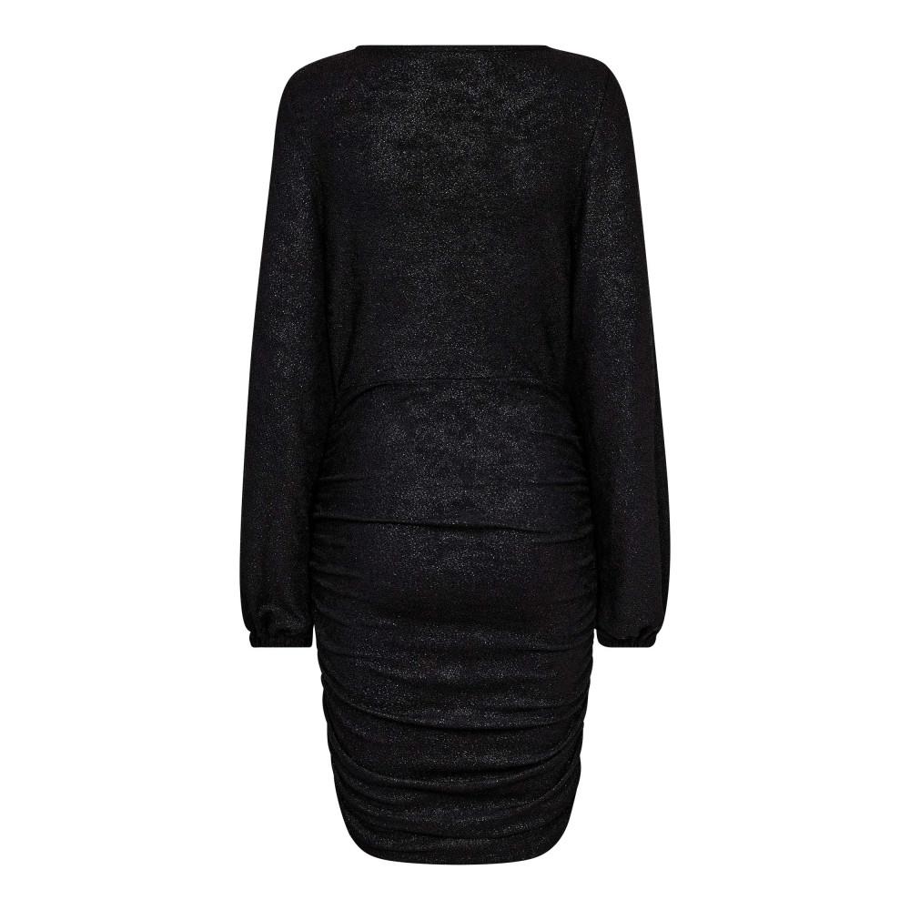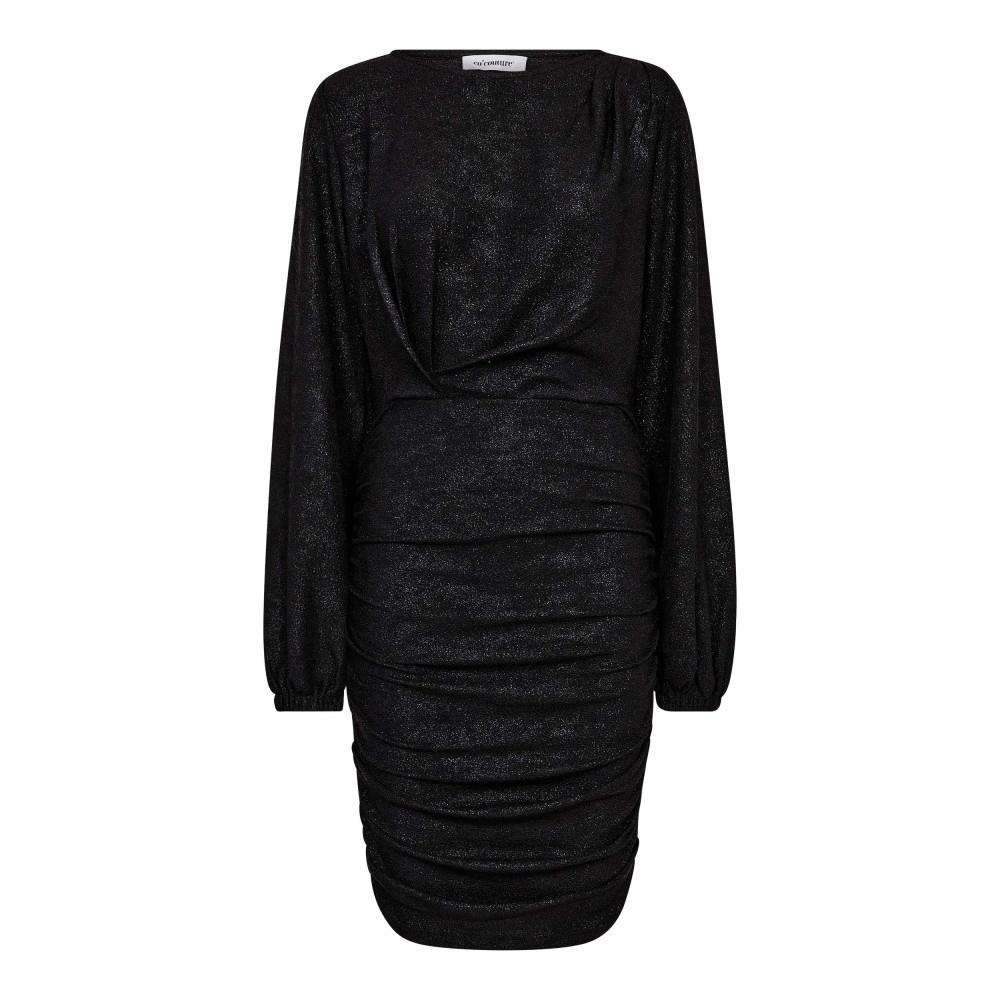 Så fin og feminin kort kjole fra Co' Couture i sort i materiale med struktur og let glitter effekt. Kylie Dress er med rund hals og lange ærmer med elastikkant ved håndled. Kjolen har en løs pasform foroven og sidder til forneden, hvor den har elastikkant i siderne, som får den til at drapere flot. En virkelig elegant festkjole med et tidløst look.