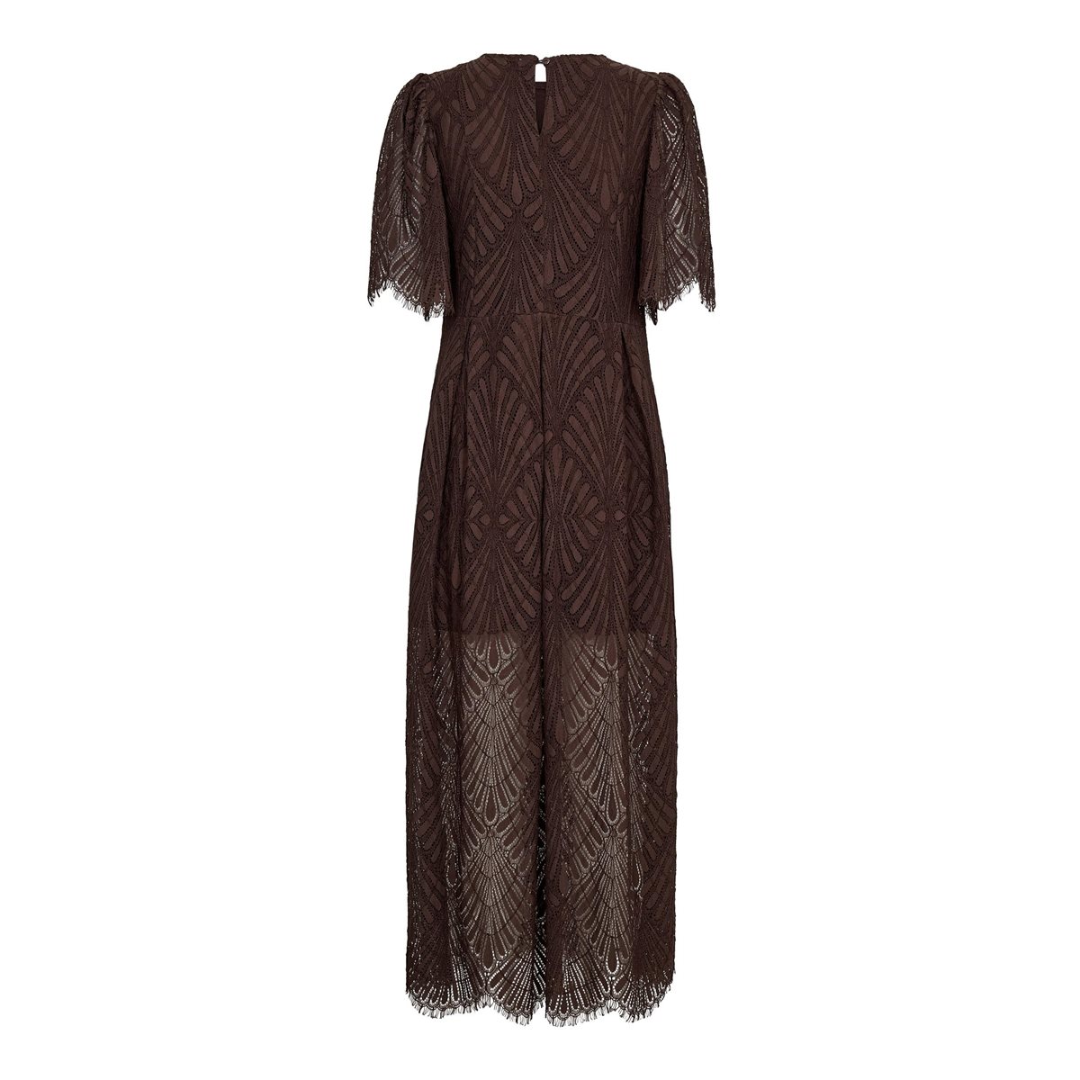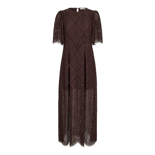 Så smuk blondekjole fra Co' Couture i brun. Leti Lace Maxi Dress er med rund hals og lukkes med en knap i nakken. Kjolen har desuden korte løse ærmer med en bølget kant forneden, som går igen nederst på skørtet. Er i en transparent kvalitet med inderskørt i det øverste stykke. Virkelig en smuk festkjole med en elegant let løs pasform.