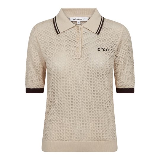 Simpelthen så fin og feminin taljelang polobluse fra Co' Couture i et hæklet look i beige med mørkebrune detaljer. Lue Pointelle Polo Knit er med krave med kontraststriber, har knaplukning foroven og korte ærmer med brun ribkant. Blusen har desuden lille fine broderet Coco logo fortil og ribkant forneden. Kvaliteten er i en lækker blød viskose.