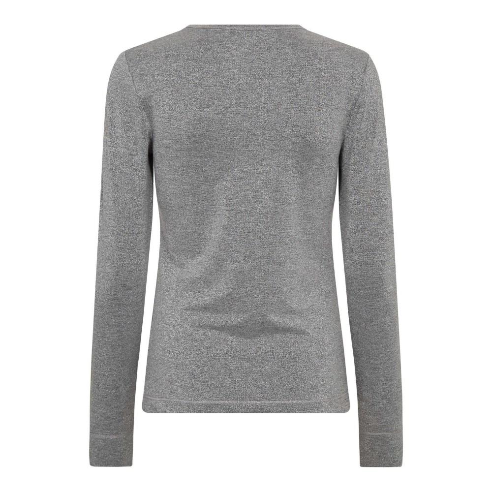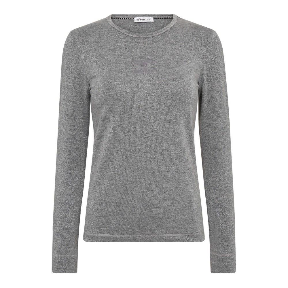 Virkelig lækker basic bluse fra Co' Couture i en partyudgave i grå med sølv lurex detaljer.. Manny Lurex Emb LS Tee har rund hals, en forholdsvis tætsiddende pasform og lange ærmer. Blusen er i en lækker blød kvalitet med fint lille broderet CC logo i front i en kvalitet med stræk.