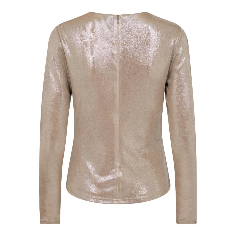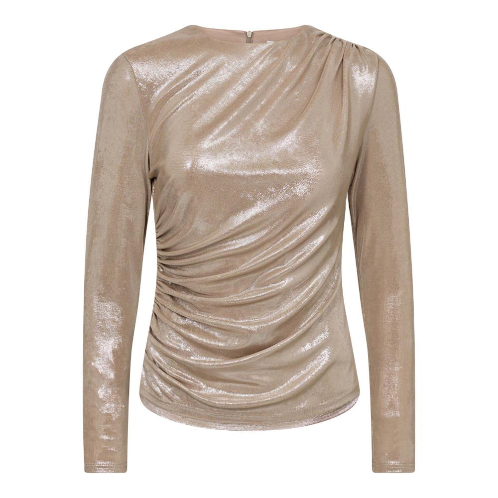 Så fin og feminin bluse i den fineste skinnende champagne farve fra Co' Couture. Margot Drape Blouse har rund hals, lange ærmer og lukkes med lynlås i nakken. Blusen har de smukkeste draperinger, som giver et elegant look og er på alle måder en style, der er oplagt til fest. Der er viskose inderfoer og materialet er med masser af stræk.