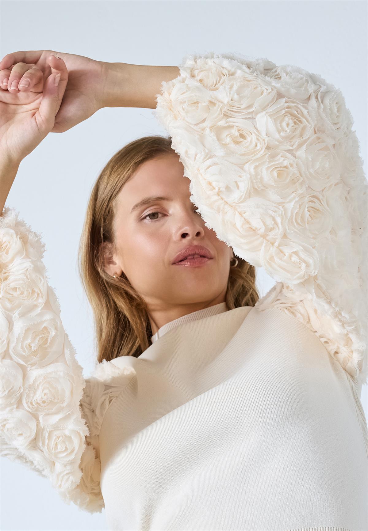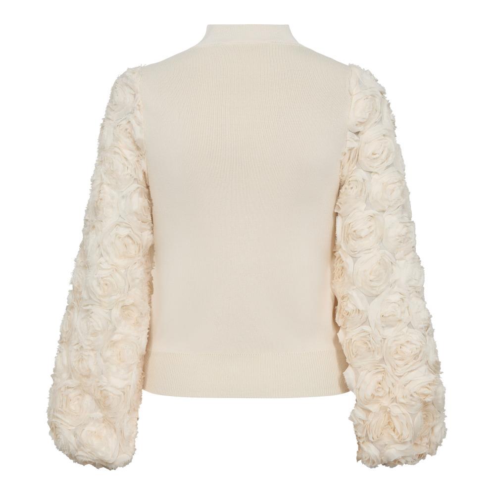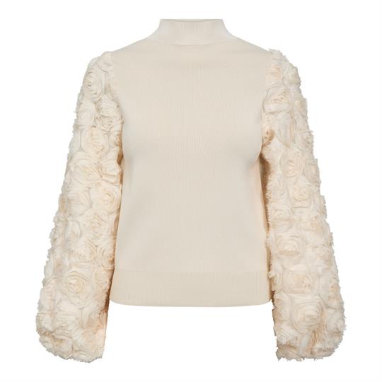 Den fineste strikbluse fra Co' Couture i råhvid med de smukkeste detaljer. Mercia Rose Mix Knit er i en lækker viskosemiks strikkvalitet med lille høj høj krave og en forholdsvis tætsiddende pasform. Blusen har de smukkeste ærmer med en 3D effekt med roser og elastikkant ved håndled. En virkelig smuk og feminin bluse, der bare har wauw effekt.