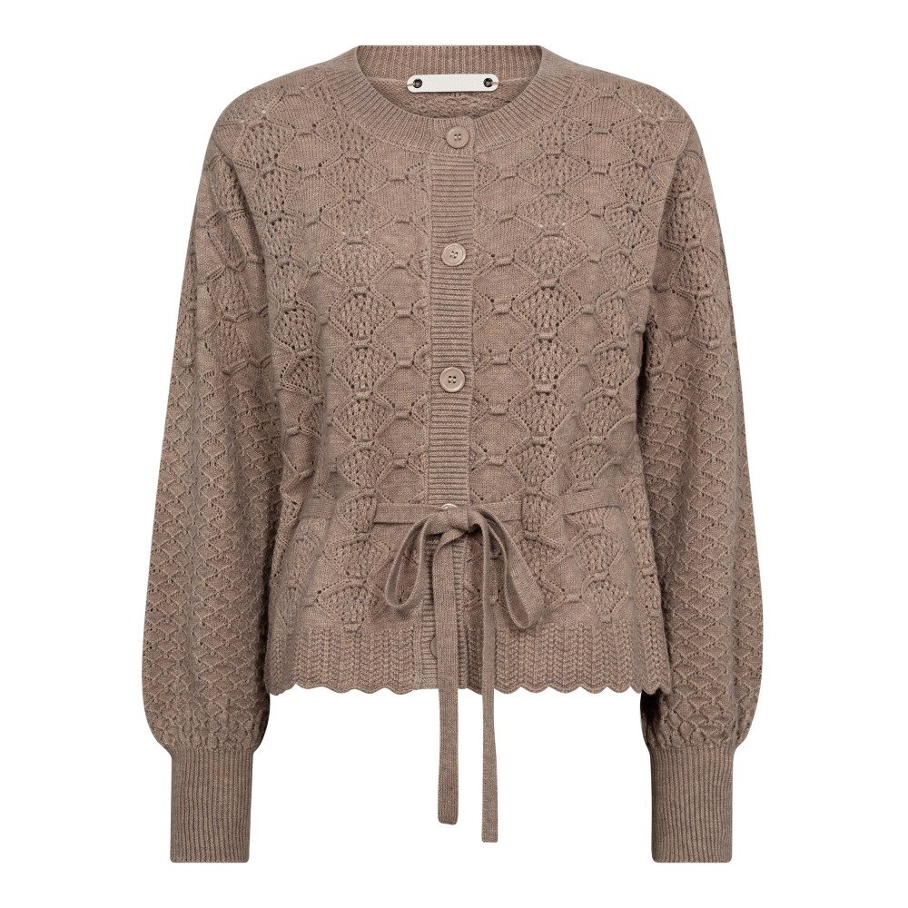 Så flot og lækker gennemført kabel strik cardigan fra Co'Couture. Row Pointelle Tie Cardigan er i en virkelig lækker blød kvalitet som ikke kradser. Cardiganen er gennemknappet og er med et aftagelig strikbånd i taljen, som indsættes i hullerne. Strikken har ribkant ved ærmerne og ved halsen og er afsluttet med en virkelig sød bølget kant forneden. Strikken er taljelang og passer perfekt til f.eks. et par jeans.