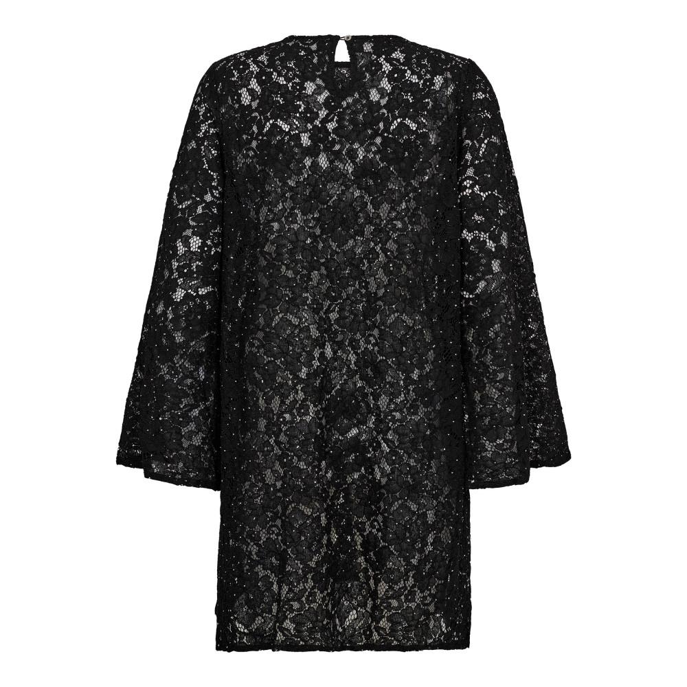 Så smuk blondekjole med små similisten fra Co' Couture. Sia Simili Lace Dress kommer i en virkelig smuk let kraftig blondekvalitet. Kjolen har et smukt A-snit og er med brede ærmer der har trompetfacon. Kjolen er gennemsigtig, så vil kræve enten en underkjole under eller en top og et par indershorts, eller du kan vælge at bruge den uden over et par bukser. Kjolen går ca. over knæerne, alt efter højde, moddelen er 190 høj. Virkelig en smuk style til fest.
