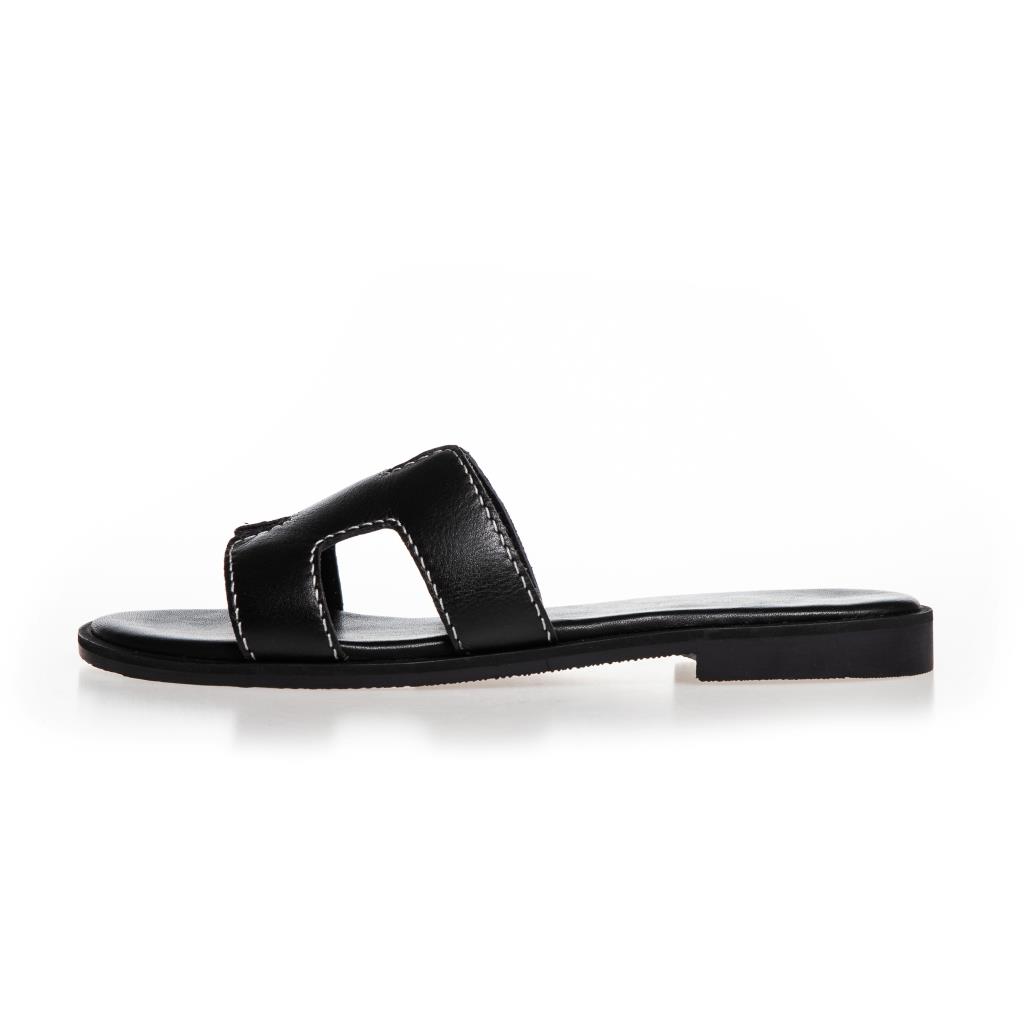 Virkelig fine slipin sandaler fra Copenhagen Shoes i sort skind med hvide stikninger. All For Love er en elegant og enkel sandal med det karakteristiske H-formede cut-out design, som giver et stilrent og moderne udtryk til foden. Sandalen har en flad, fleksibel TPR-sål og en blød indersål, der gør den behagelig at bruge i hverdagen. En tidløst style, som passer perfekt til både kjoler, jeans og shorts.