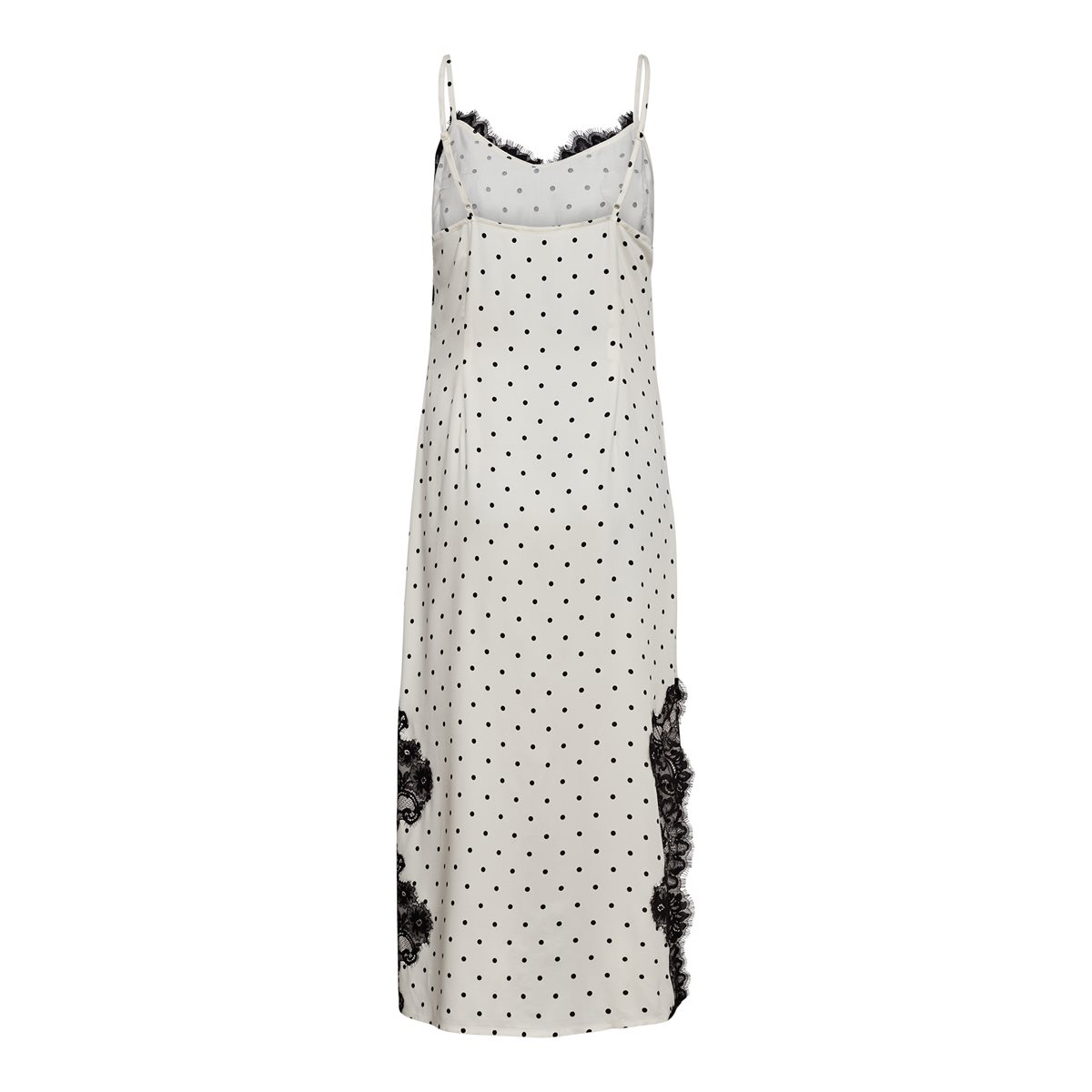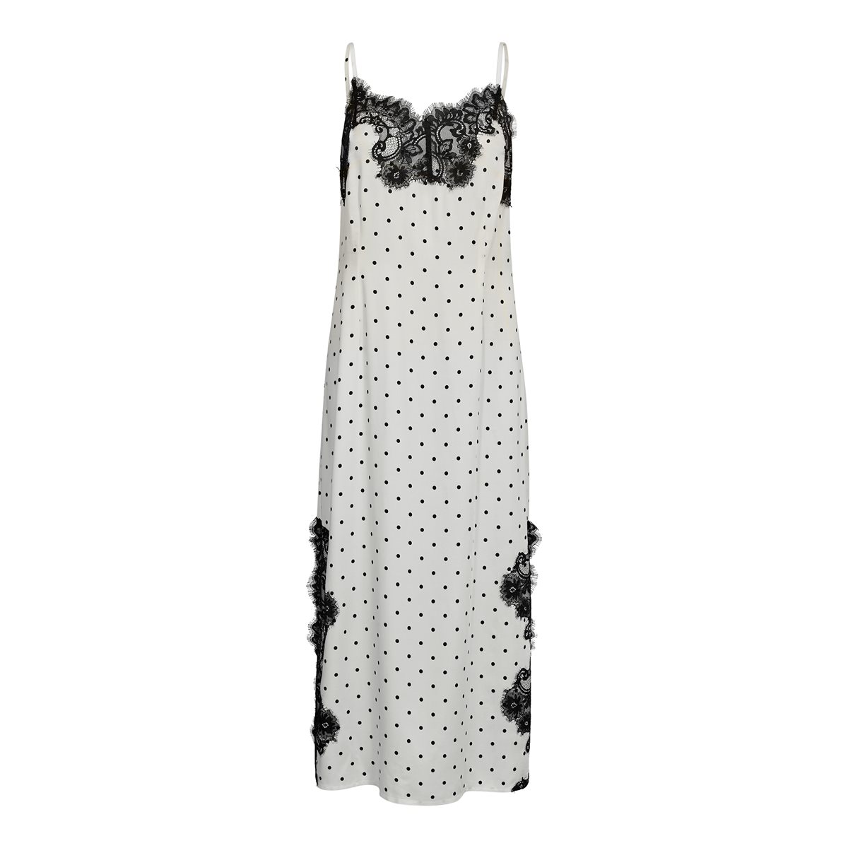 Den fineste satin kjole med prikker og blondedetaljer fra Co'Couture. Ameli Dot Lace Strap Dress er med justerbare stropper og har blondekant fortil ved udskæringen og i begge sider, hvor der også er høj slids. Kjolen har små sort prikker, og prikker er virkelig kommet for at blive. Kjolen som du både kan style til fest og til hverdag evt. med bukser under.