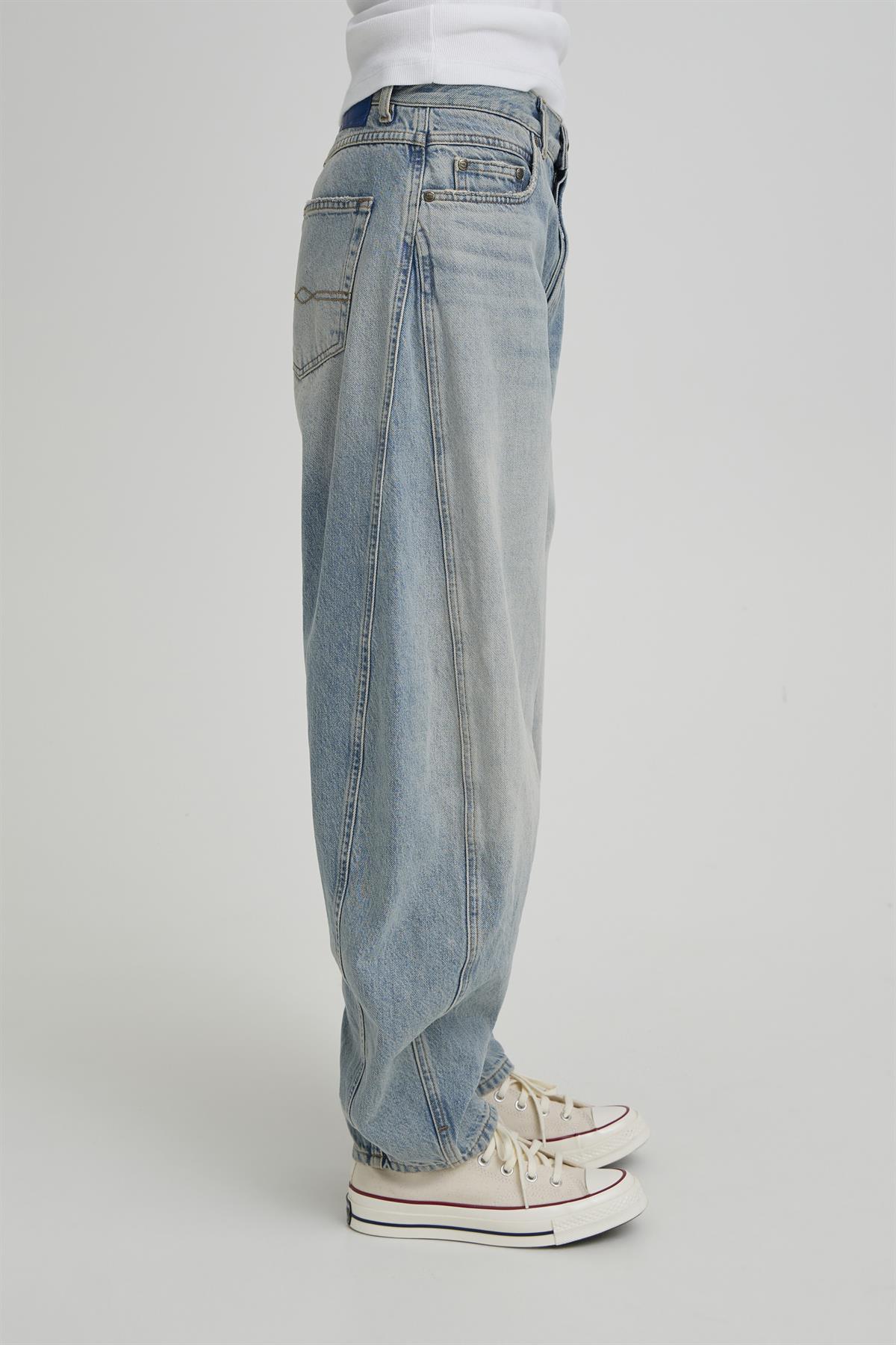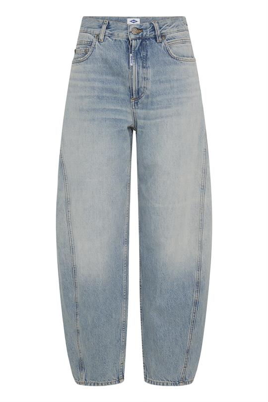 Så cool jeans fra Ball i en lys slidt vask. Cavi Curved Jeans er med et barel fit med vidde i benene og et ekstra stykke stof i siden, som giver et virkelig cool look og let indsnævring ved ankler. Jeansene lukkes med lynlås og knap, har bæltestropper, lommer i siderne og baglommer. Der er diskret logo fortil og logoskilt bagpå ved taljen.