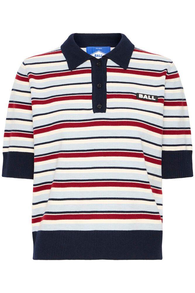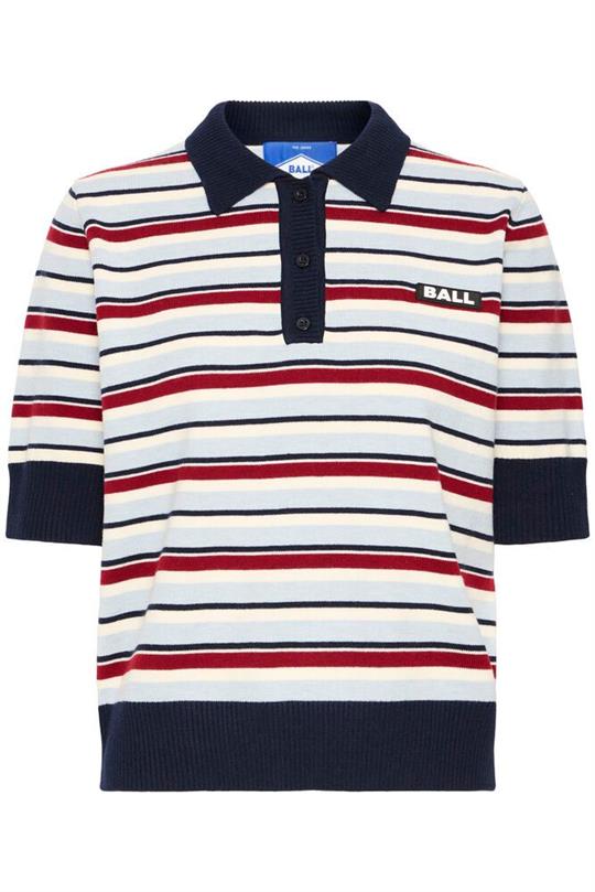 Lækreste polo strik med korte ærmer i en virkelig flot farvekombination med vinrøde, offwhite, lyseblå og navy striber. Marietta Knit Polo er med klassisk skjortekrave og lille stolpelukning med tre blå knapper fortil samt et Ball logo i gummi som er påsyet. Poloen har et kort ærme med bred ribkantafslutning og ribafslutning forneden. Blusen har en let løs pasform og er det perfekte match til et par rå jeans. Poloer er kommet for at blive, og her får du virkelig en lækker en af slagsen i en super blød og behagelig kvalitet som ikke kradser.