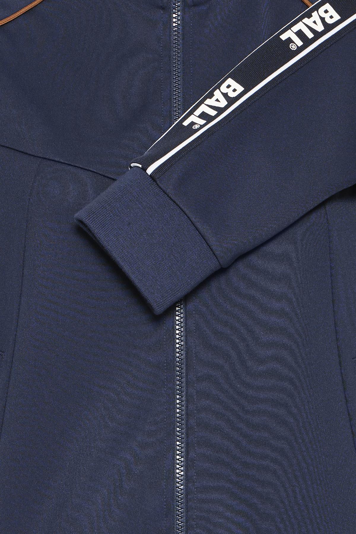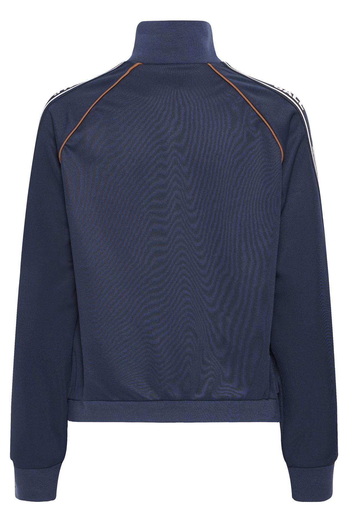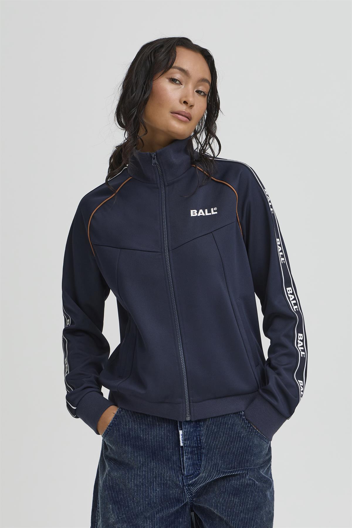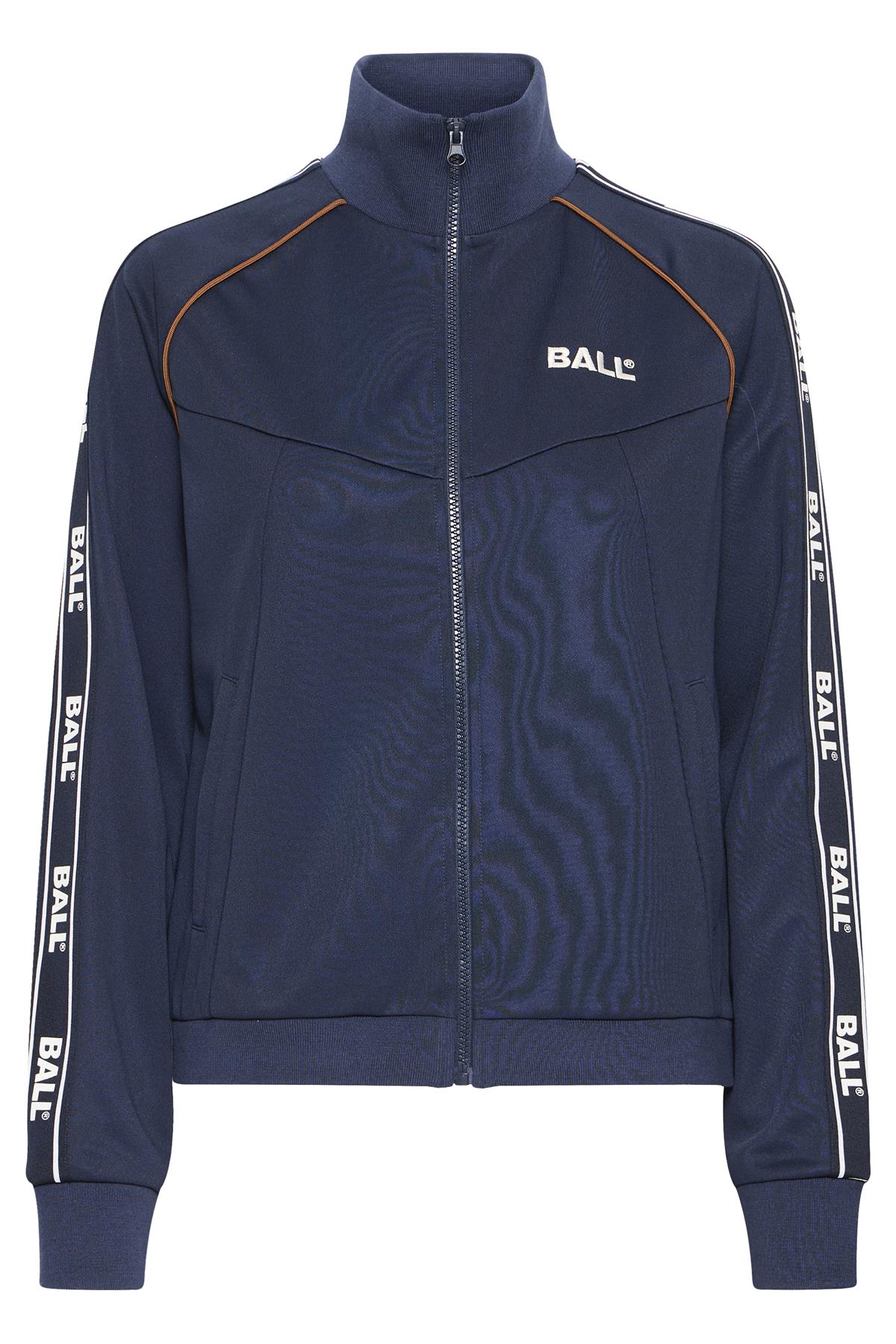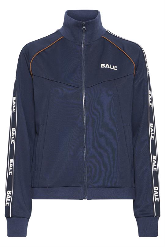 Så cool trackjakke fra Ball i navyblå med hvide og camelfarvede detaljer. Nicolina Track Jacket er med lommer i siderne, har høj krave og lukkes med lynlås i front. Sweatshirten er med lange ærmer med logo og hvide striber ned af siderne samt lille logo fortil. En virkelig trendy og sporty style, der med fordel kan styles med matchende trackbukser.