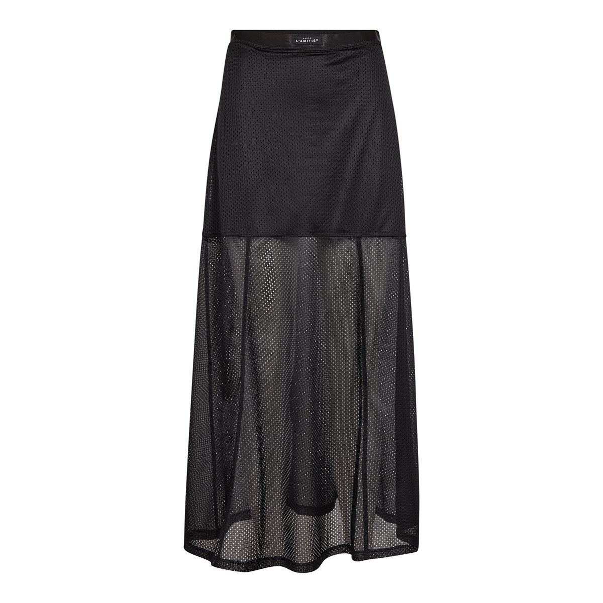 Så cool nederdel fra Haute L´Amitié i sort. Drift Skirt har elastikkant i taljen med diskret logoskilt fortil. Nederdelen er i en virkelig lækker netkvalitet med masser af stræk og med påsyet inderskørt i den øverste del, den nederste del er transparent og giver et virkelig fint og sporty look. En virkelig smuk nederdel med et lille a-snit og med fin lille detalje med påsyet logoskilt bagpå. En anvendelig style både til hverdag og fest.