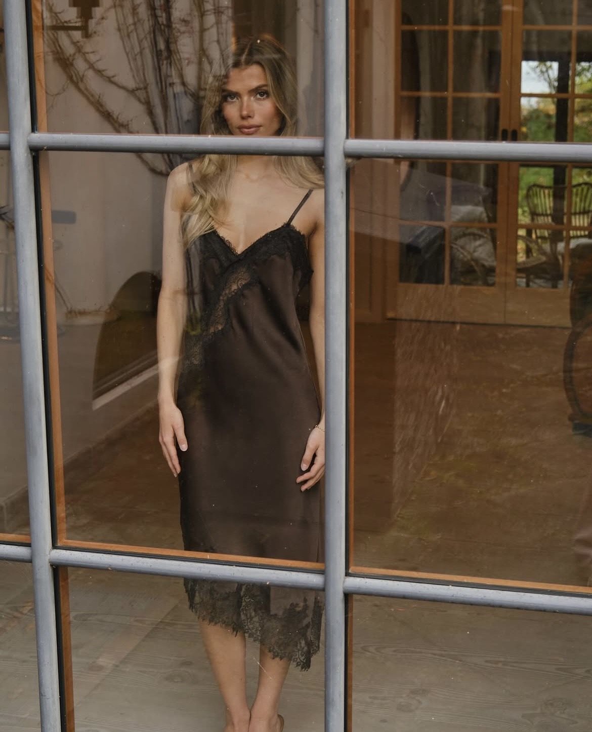 Virkelig smuk og feminin satinkjole fra Neo Noir med blonde detaljer med et asymmetrisk snit i brun. Sorelle Lace Dress har tynde justerbare stropper, har blondekant foroven og forneden med et stykke blonde der er syet asymmetrisk skråt forneden. Virkelig en pæn style der kan bruges udenover både jeans og pæne bukser eller som den er som kjole. Dette look bliver stort denne sæson. Modellen er 176 cm og bærer en størrelse 36.