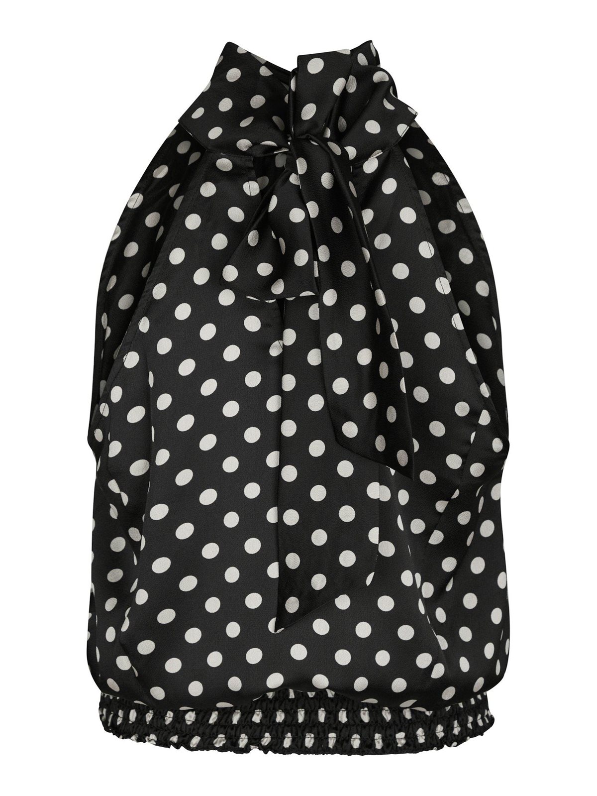 Så fin prikket top fra Neo Noir i sort med hvide / offwhite store prikker. Jos Dot Top er med halterneck som bindes i nakken. Toppen har elastikkant forneden, hvor den sidder til og er uden ærmer med let løs pasform. Toppen er i en lækker blød satinkvalitet (100% polyester), som er let og lækker at have på. Så flot at style til en festlig nederdel og til hverdag til et par af dine yndlings jeans.