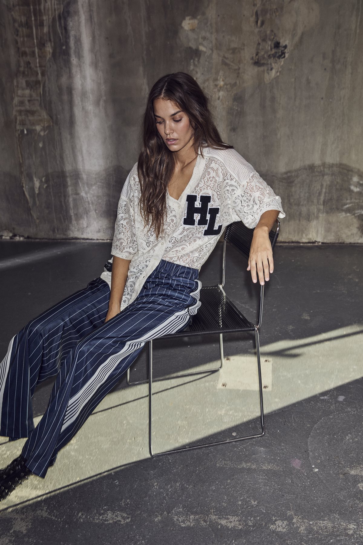 Virkelig smuk blonde T-shirt fra Haute L' Amitié i farven pearl. Court Lace Tee har v-udskæring, er gennemknappet og har korte ærmer. Blusen er i en kombination af en fin blonde og netdetaljer ved skulderpartiet samt et stort HL fluffy logo fortil. En virkelig feminin style med et sporty look. Obs er transparent og vil kræv en top eller langærmet t-shirt under.