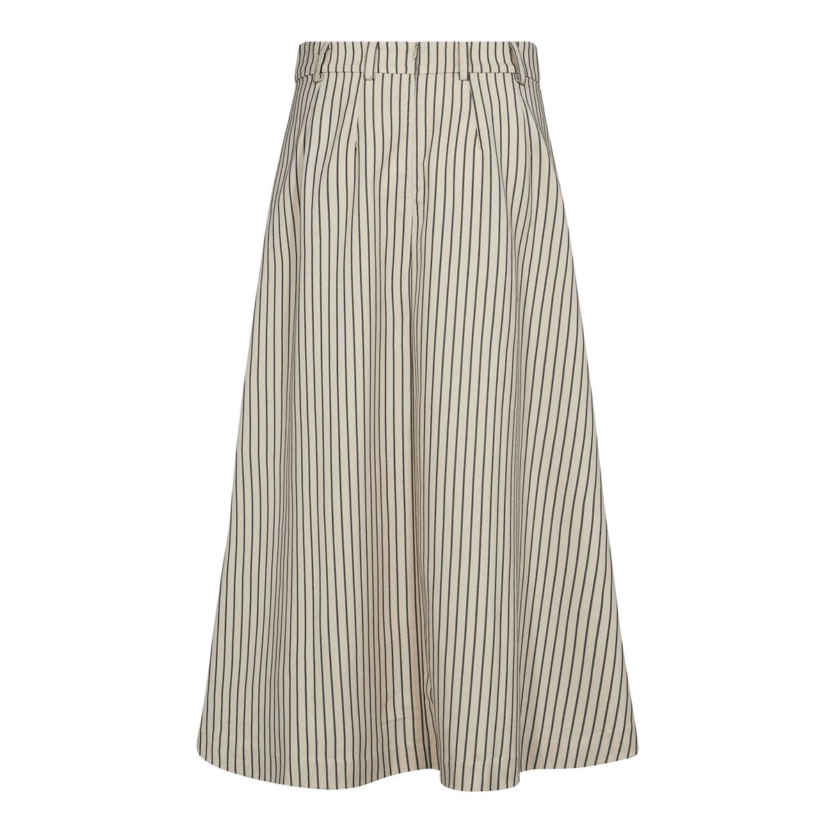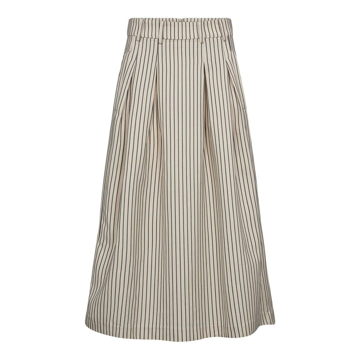 Co' Couture populære nederdel kommer nu i en fin nålestrib i farven white, som er offwhite med en mørk grålig strib. Anya Salvie Skirt er med bæltestropper i taljen og lukkes med lynlås bagpå. Nederdelen har de fineste draperinger ned i skørtet og lommer i siden. Falder utrolig smukt og er bare nem at style til både støvler, sneaks eller sandaler. En virkelig skøn og tidløs style, der er perfekt at style til alle slags overdele.