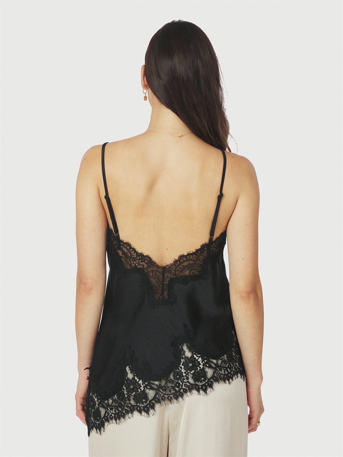 Virkelig smuk og feminin satintop med blonde detaljer med et assymetrisk snit. Viole Lace top i black har tynde justerbare stropper, har blondekant foroven og forneden med et stykke blonde der er syet assymetrisk. Virkelig en pæn style der kan bruges til både jeans og pæne bukser. Ville også være flot at style til et habitsæt. Det assymetriske look bliver stort denne sæson. Modellen er 176 cm og bærer en størrelse 36.
