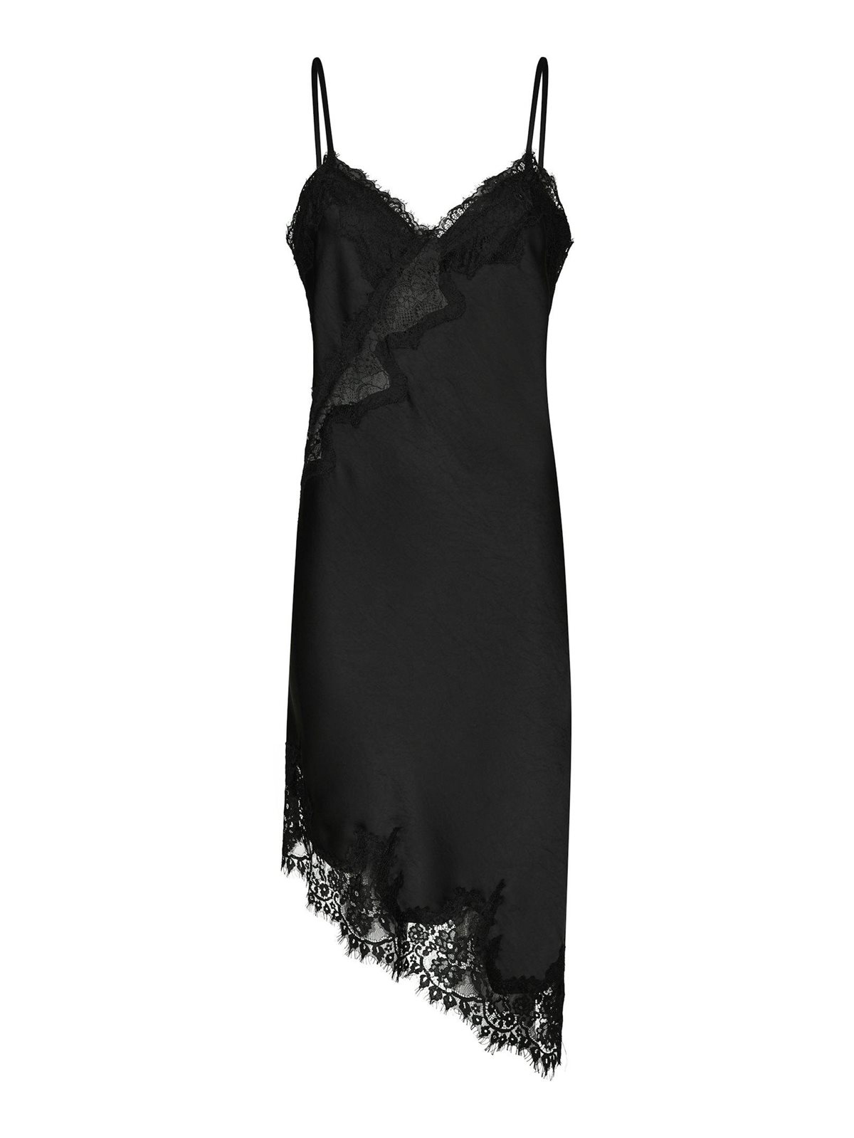 Virkelig smuk og feminin satinkjole fra Neo Noir med blonde detaljer med et asymmetrisk snit i sort. Sorelle Lace Dress har tynde justerbare stropper, har blondekant foroven og forneden med et stykke blonde der er syet asymmetrisk skråt forneden. Virkelig en pæn style der kan bruges udenover både jeans og pæne bukser eller som den er som kjole. Dette look bliver stort denne sæson. Modellen er 176 cm og bærer en størrelse 36.