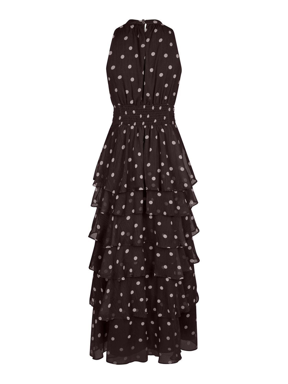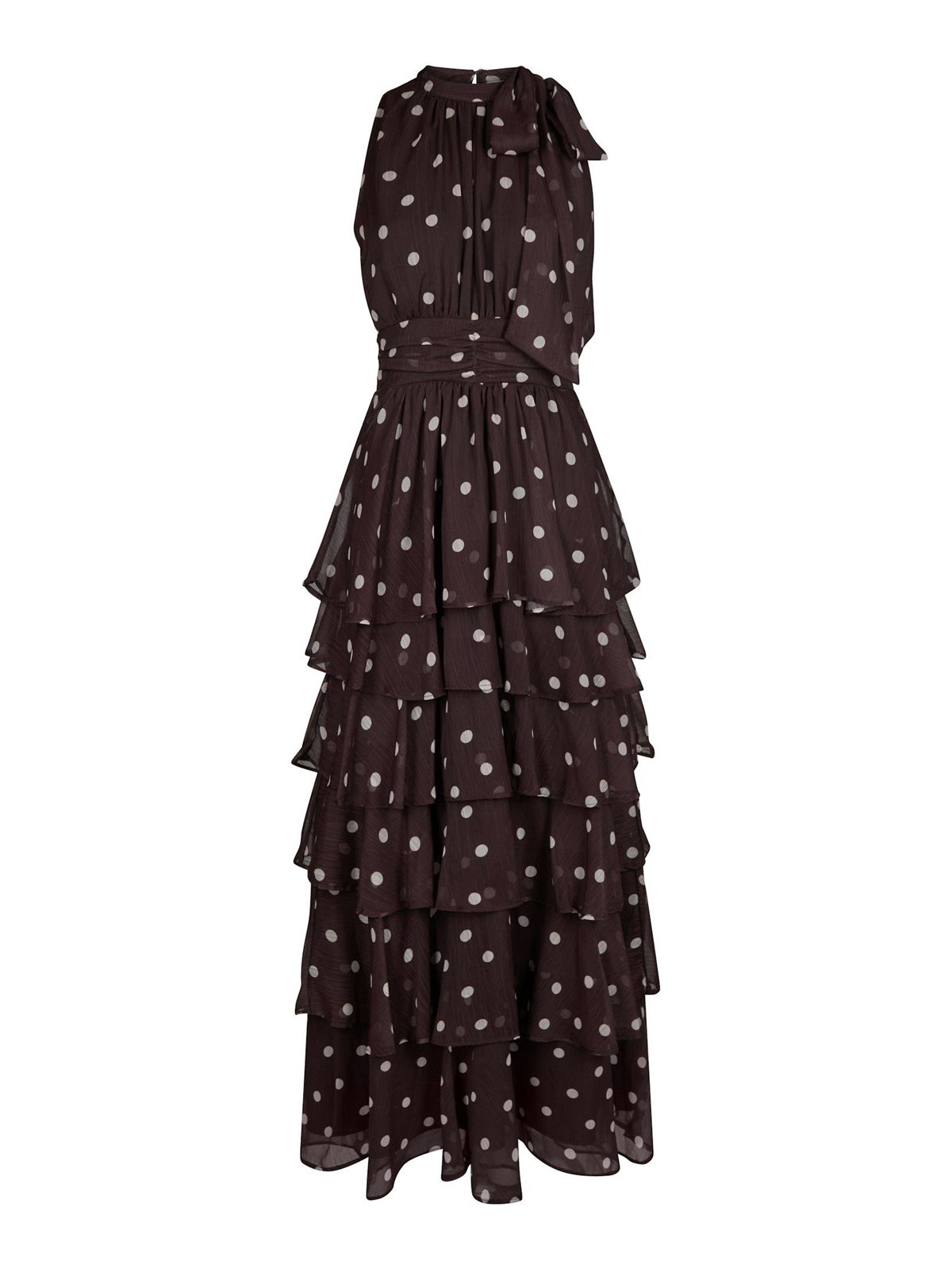 Smukkeste festkjole fra Neo Noir i brun med råhvide prikker. Marli Big Dot Dress  er uden ærmer og med halterneck med et bindebånd ved halsudskæringen, har smock under brystet og et løst skørt forneden. Kjolen har desuden chiffonlag, som gør den falder utrolig smukt. Virkelig en kjole med wauw effekt og er oplagt til fest som en utrolig elegant og feminin style.