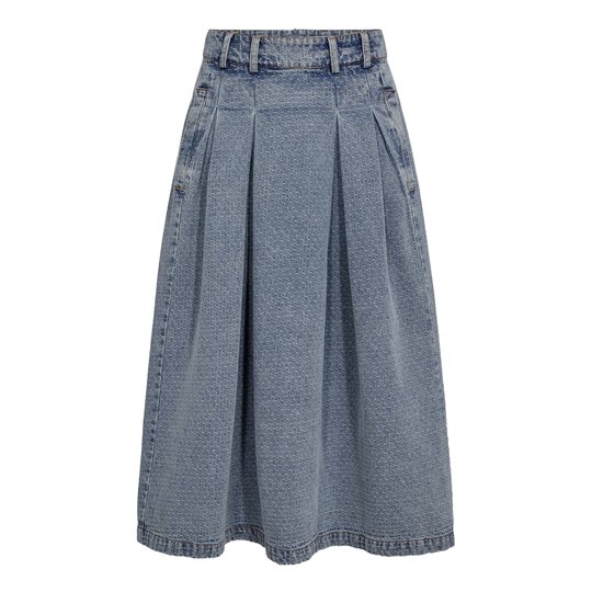 Så fin denim nederdel med prikfryns detaljer i deres populære Anya model. Lova Anya Pleat Skirt er lavet i en lækker blød denimkvalitet og har let revet lignende prikker i stoffet. Nederdelen er med læg detaljer fortil, bælter stropper og lommer i siden. Lukkes bagtil med skjult lynlås. Har en midi længde, som gør den anvendelig både til støvler og en sandal om sommeren. Der findes matchende Lova bluse til.