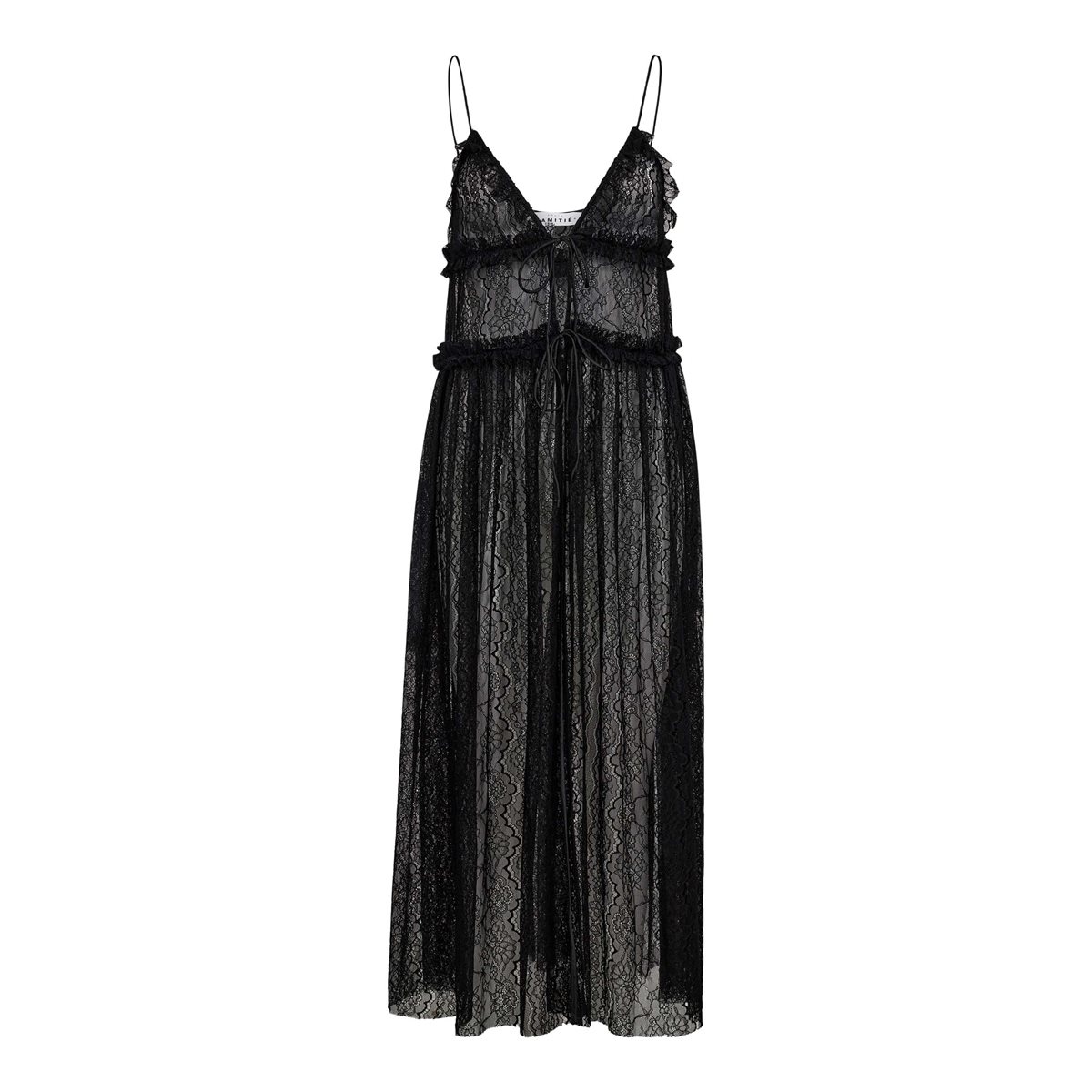 Simpelthen så smuk blondekjole fra Haute L' Amitié i sort. New Lace Tie Dress er med stropper og er i den fineste blondekvalitet med flæsedetaljer. Kjolen går ned i v-udskæring og bindes med snørrer i front. Virkelig en fin og feminin style i en transparent kvalitet, som kan styles uden over en top/t-shirt og bukser. Så flot og helt unik style, til hverdag til fest, til festivals.