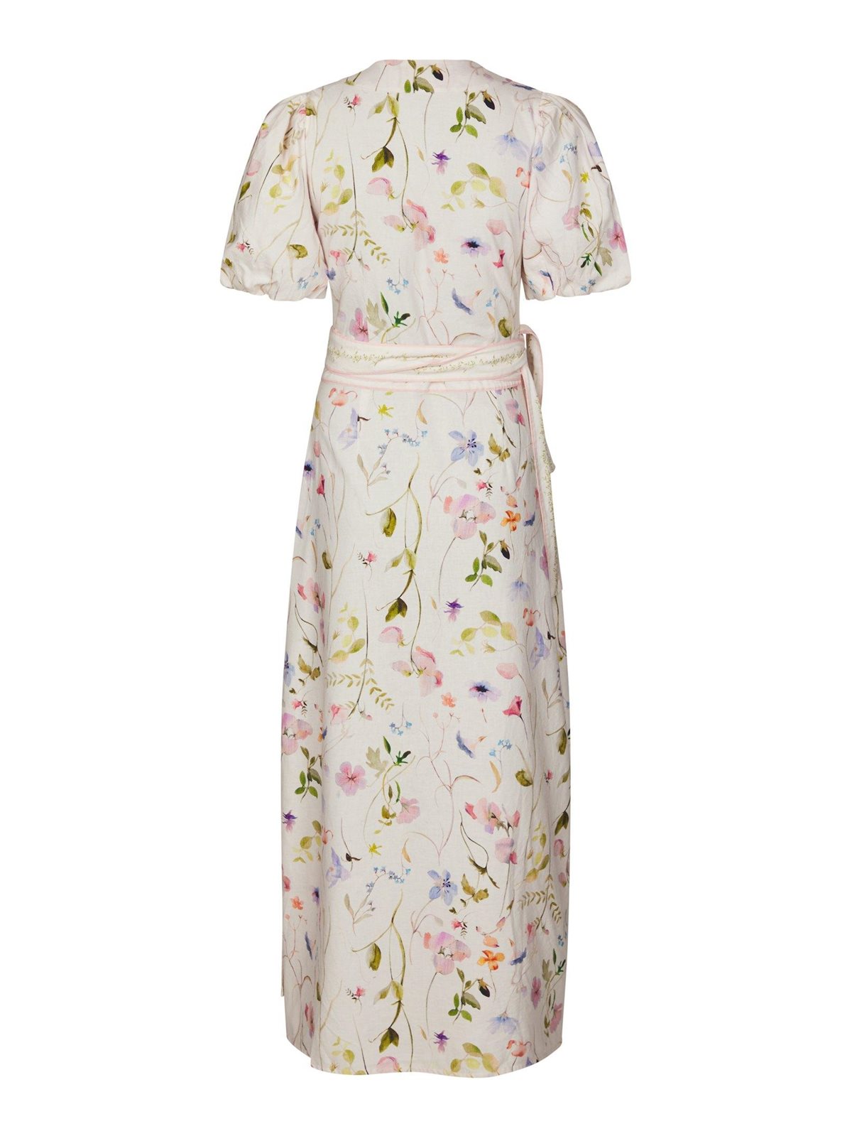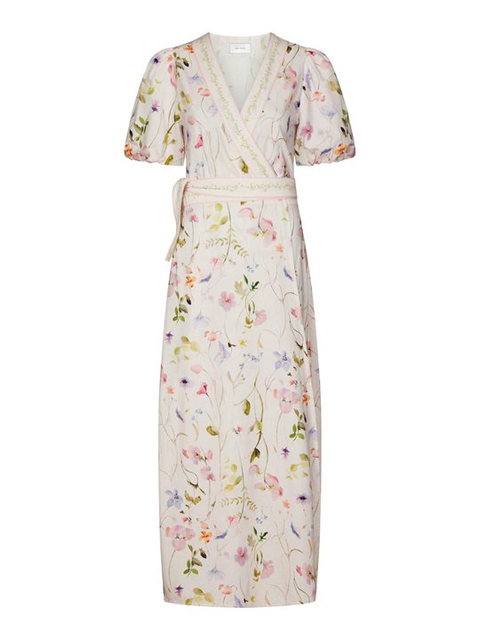 Smukkeste kjole med blomsterprint og off white bund fra Neo Noir. Clarine Flower Dress er en virkelig fin wrap-kjole med et lille puff-ærme med indvendig elastik. Kjolen er med det fineste blomster print i rosa, blå og grønne nuancer i en lækker bomuld / hør mix. Er lavet med en flot kant ved den dybe udskæring og rundt i taljen. Bindes i den ene side, hvor den fremhæver taljen smukt. Virkelig en smuk sommerkjoler, som både egner sig til hverdag som til fest.