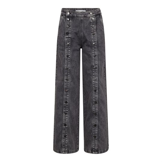 Så seje jeans med knappe detaljer fra Co' Couture i sort denim. Willa Button Jeans er i en sej forvasket denim og har Co'Couture logo knapper hele vejen ned på hver lår. Bukserne har lommer i siderne og to baglommer. Er med brede ben og tæt pasform for oven. Knapperne midt på låret slanker og giver en flot pasform. Virkelig en sej og anderledes jeans.
