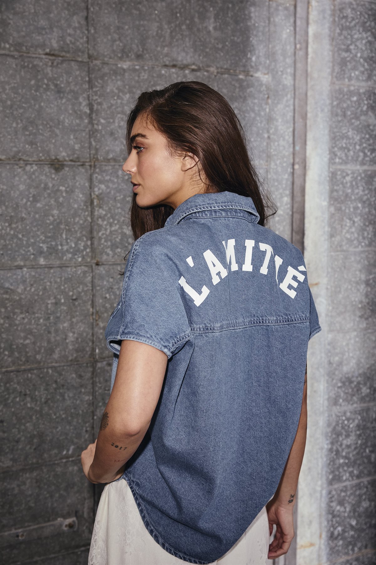 Så cool denimskjorte med seje og i en virkelig flot denimvask med slid fra Haute L' Amitié. Denim Ns Logo Shirt er kortærmet med klassik krave og knaplukning. Har en brystlomme med sort logo og bagtil stort hvidt L' Amitié logoskrift. Skjorten er virkelig cool at style til de feminine styles, men er også helt ideel til et par denim jeans.