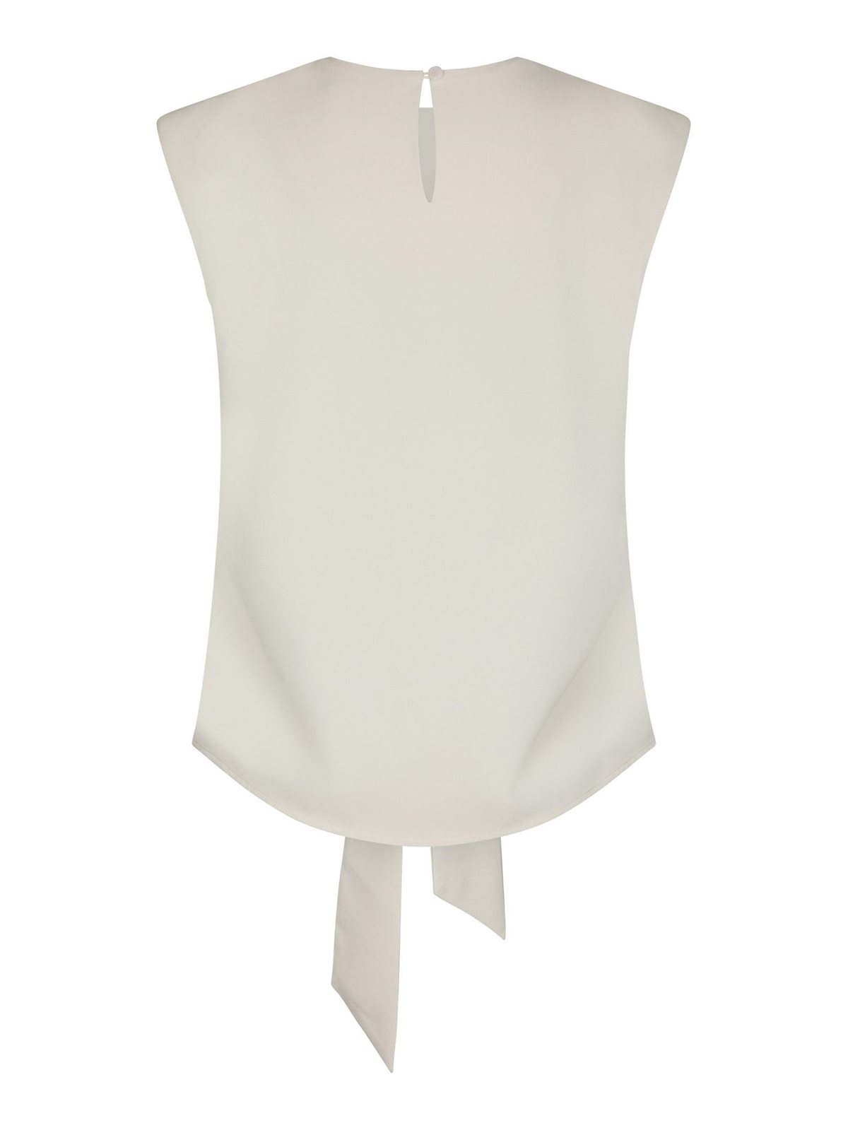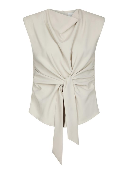 Så flot top fra Neo Noir i farven ivory. Katarim Crepe Top har smuk bindedetalje fortil, som både slanker og giver toppen et eksklusivt look. Toppen har lette skulderpuder og er uden ærme, rund hals lille høj hals med drapering fortil og lukke bagtil med knap. Bindes ind i taljen og går derefter lidt ud. Sidder virkelig flot på og er oplagt til fest. Der findes matchende bukser til, Lunet Crepe Pants, for et flot elegant sæt.