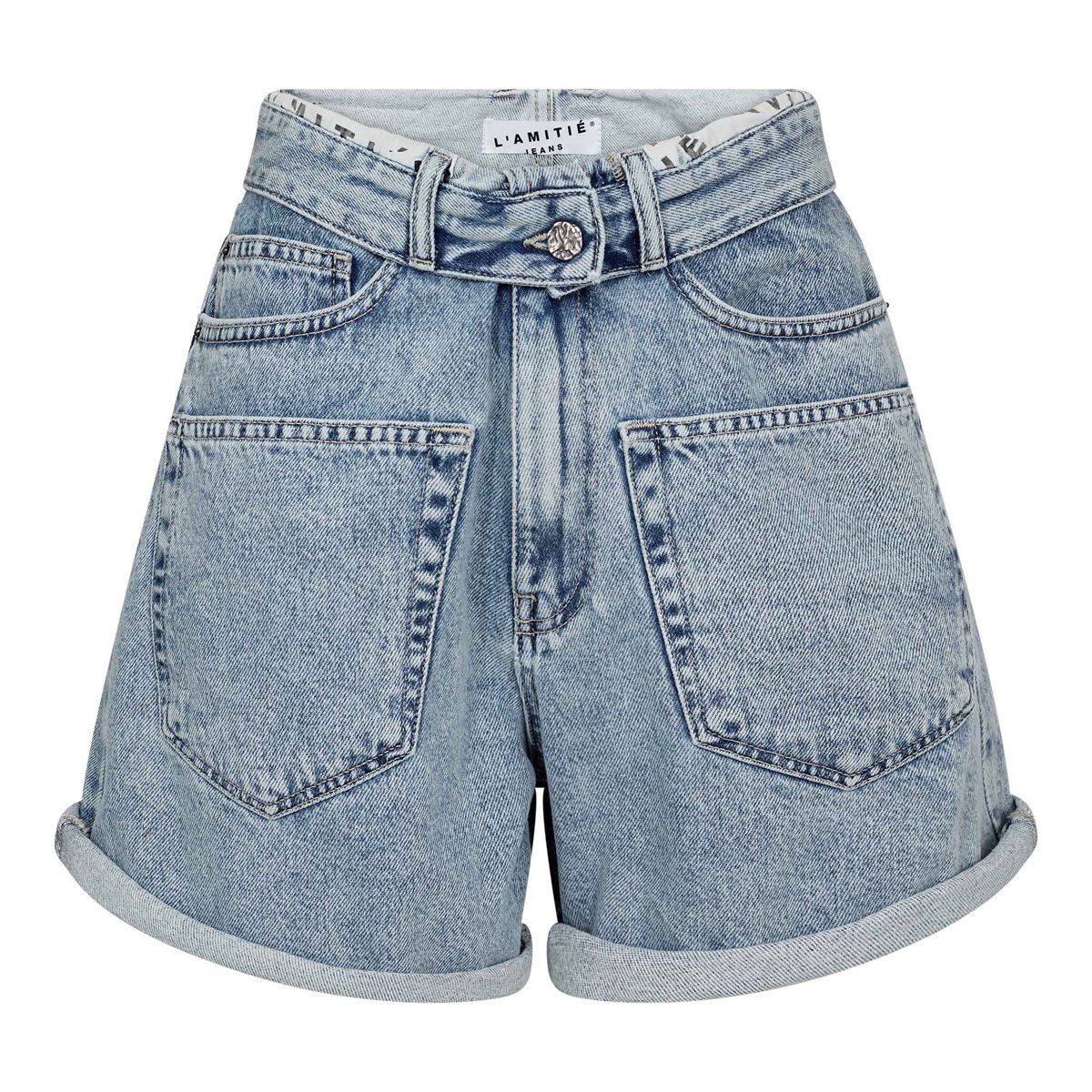Så cool denimshorts fra Haute L' Amitié i en forvasket lys denim. Flip Waist Shorts er med et bukket stkke i taljen, hvor man kan ane foret med logoprint. Shortsene lukkes med lynlås og knap, har bæltestropper, lommer i siderne og store lommer i front. Der er desuden mulighed for at lave et lille opsmøg forneden, som giver et lækkert afslappet look.