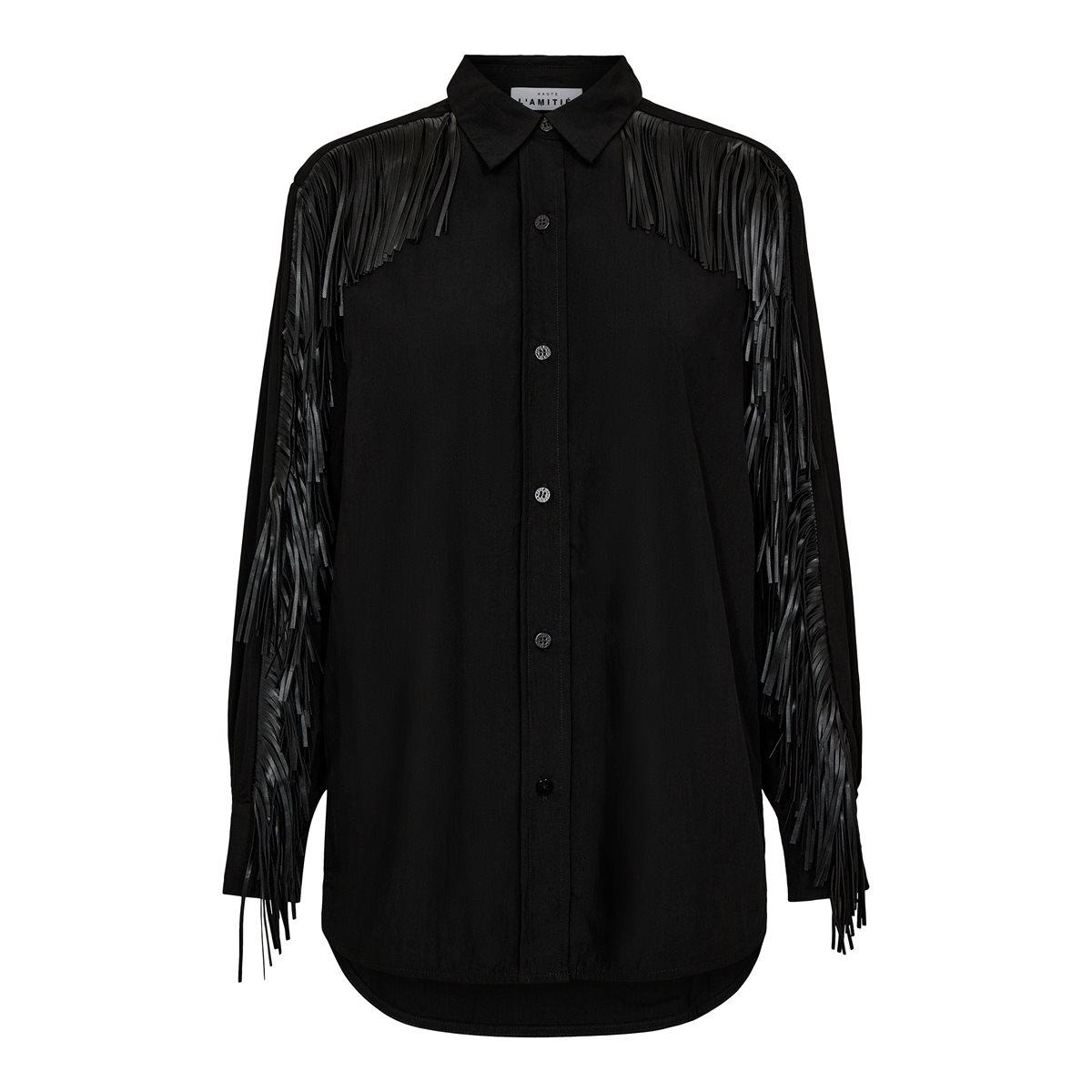 Sejeste skjorte med frynser ned langs ærmerne. Fringe Shirt Black er i den lækreste bløde viscoseblanding. En klassisk skjorte pasform med knapper hele vejen ned og skjortekrave, påsyet logo bagpå. Skjorten er længere bagtil end foran og dækker lidt af numsen. Virkelig en cool og anderledes skjorte der kan pifte dit outfit op. Style den til et par rå jeans eller til en kort skirt som på billedet.