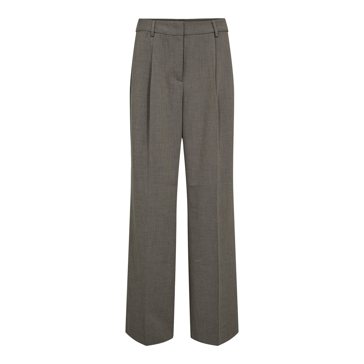 Så fine habitbukser fra Haute L'amitié i mørk meleret beige (OBS er en mellemting i farve af produktbilledet og modelbillederne). Nicole Pleat Pant er udformet med fine læg, bæltestropper, skrå sidelommer samt en paspoleret baglomme med fin satindetalje. Bukserne har midwaist og er med vidde i benene som falder flot. De lukkes med skjult lynlås, hægt og skjult knap. En virkelig lækker buks, som med fordel kan styles med matchende blazerjakke.