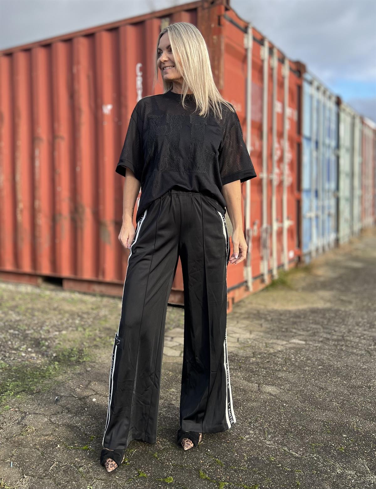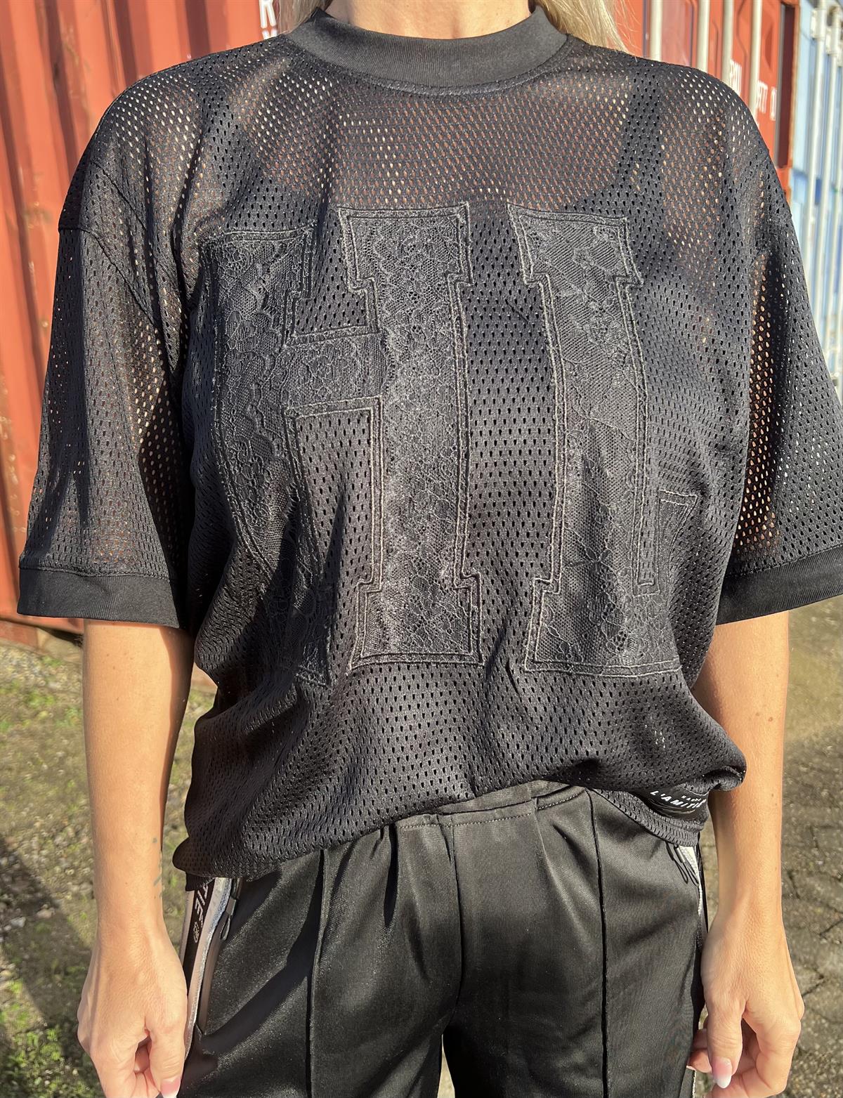 Så smuk og cool t-shirt i hulmønstret kvalitet fra Haute L' Amitié. Drift HL Lace Tee er en let oversize tee i sort med logo i form af et stort HL foran i smuk blonde. T-shirten har god længde og går til ca. midt numse alt efter højde selvfølgelig. Den har en let løs pasform og er transparent, så den vil kræve en top under. T-shirten har ribkant ved halsen og ærmerne og et påsyet logo forneden. Virkelig en smuk og helt unik style, som er nem at style til et par jeans eller Haute L' Amitiés  track pants.
