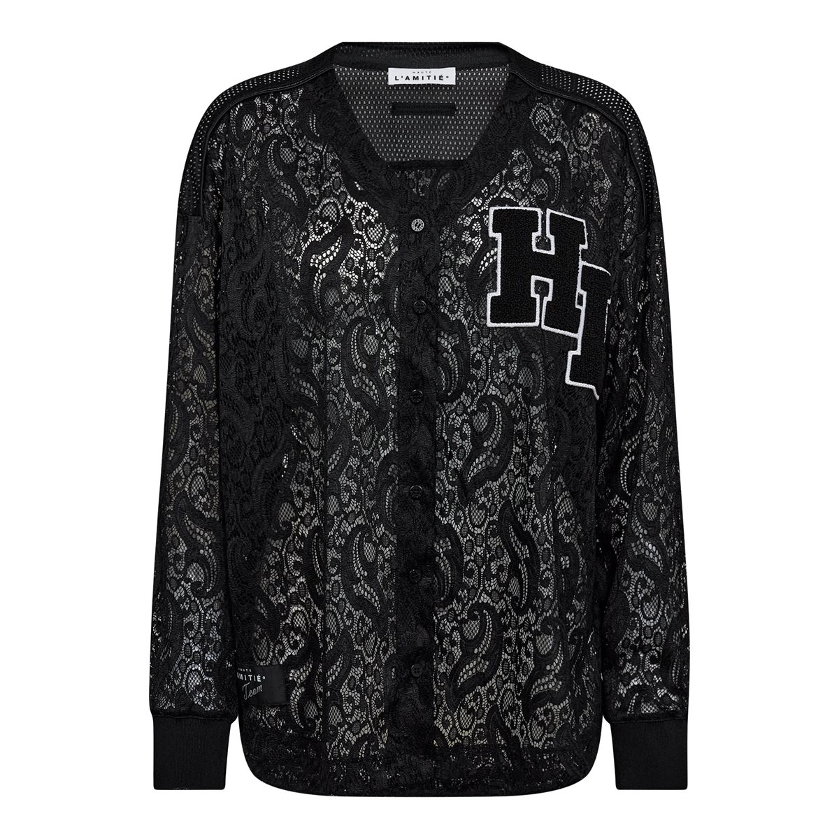 Virkelig smuk blondebluse fra Haute L' Amitié. Court Ls Lace Tee har v-udskæring, er gennemknappet og har lange ærmer med ribkant ved håndled. Blusen er i en kombination af en fin blonde og netdetaljer ved skulderpartiet samt et stort HL fluffy logo fortil. En virkelig feminin style med et sporty look. Obs er transparent.