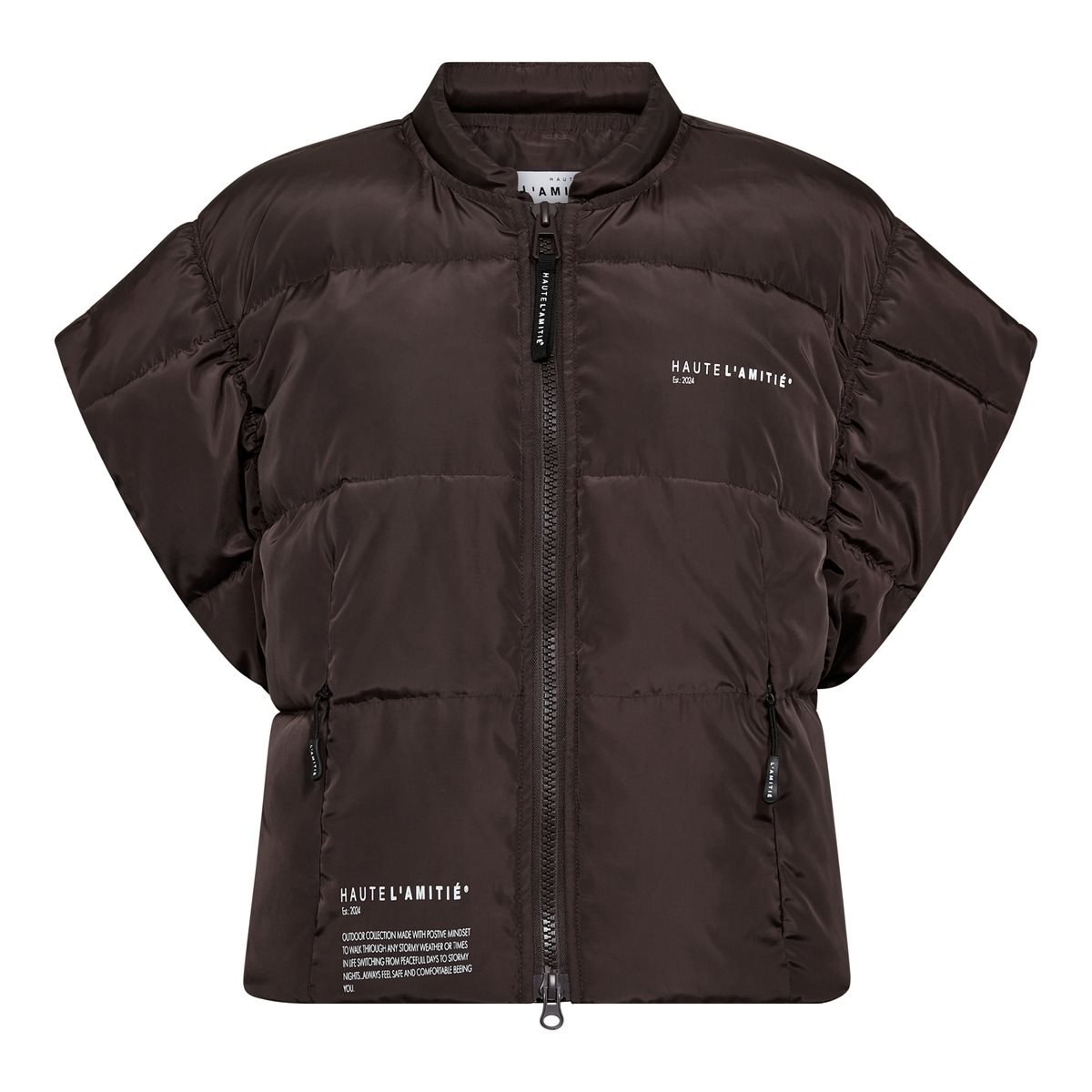 Alt for cool puffervest fra Haute L' Amitié i mørkebrun. Mount Puffer Vest Har 2-vejs lynlås, skjulte lommer i siderne med lynlåslukning og et lille ærme. Vesten er i en lækker kvalitet med let shine og fine logoskrift detaljer samt lille logoskilt bagpå i nakken. Har en oversize pasform og har indvendig justerbare elastiksnører forneden. En virkelig lækker style, der er oplagt i overgangsperioden som et alternativ til en jakke.