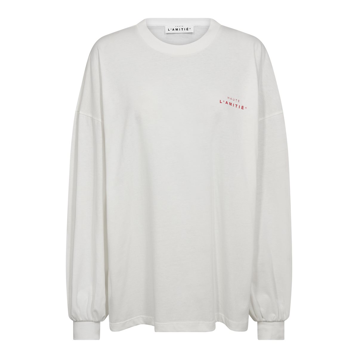 Så cool oversize langærmet t-shirt fra Haute L' Amitié i råhvid. Studio Ls Print Tee har rund hals og lange ærmer med ribkant ved håndled. Blusen har cool rødt print på ryggen og diskret lille logoprint i front.  En virkelig lækker style i 100% økologisk bomuld.