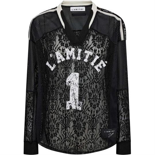 Så smuk langærmet bluse i den fineste blondekvalitet fra Haute L' Amitié i sort. Lace Football V-Blouse er med lange ærmer og er i en let oversize pasform. Blusen har fedt logoprint fortil og med striber på ærmerne, samt Haute L' Amitié logo bånddetaljer på skulderpartiet. Blusen har god længde og går til ca. midt numse alt efter højde selvfølgelig. Er transparent, så den vil kræve en top under. Har desuden v-udskæring med ribkant ved halsen og håndled. Virkelig en lækker og helt unik style, som er med et feminint og samtidigt sporty look.