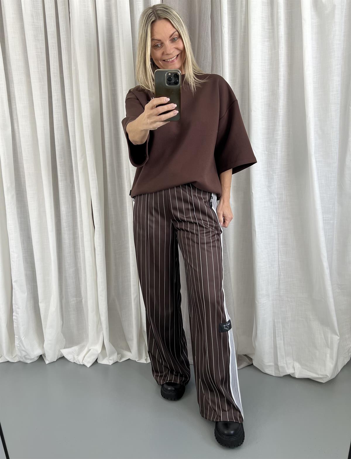 Så cool brede track bukser fra Haute L ' Amité i mocca brun med offwhite strib. Baggy Pin Stripe Track Pants er i en flot sporty kraftig kvalitet med lægdetalje fortil og stribet bånd ned langs siden, hvor der også er logomærke i den ene side, som en virkelig fin detalje. Bukserne har desuden behagelig elastikkant i taljen, lynlåslommer i siderne og har bare det helt rigtige sporty look med et feminint twist. En virkelig sej og trendy style, der følger tidens tendenser og er den helt rigtige tilføjelse til garderoben.