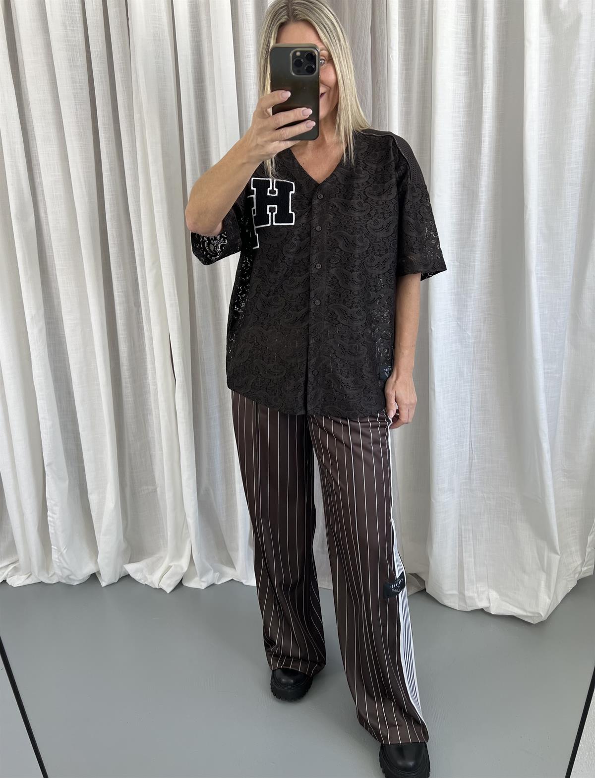 Virkelig smuk blonde T-shirt fra Haute L' Amitié i farven Mocca. Court Lace Tee har v-udskæring, er gennemknappet og har korte ærmer. Blusen er i en kombination af en fin blonde og netdetaljer ved skulderpartiet samt et stort HL fluffy logo fortil. En virkelig feminin style med et sporty look. Obs er transparent og vil kræv en top eller langærmet t-shirt under.