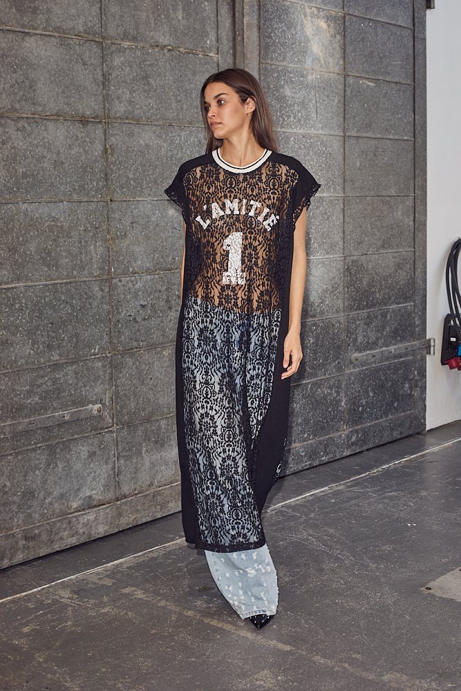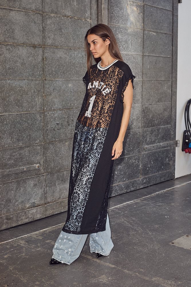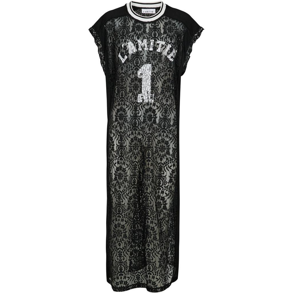 Så cool T-Shirt kjole fra Haute L ' Amité i sort med hvide detaljer. Lace Football Frill Dress er i en virkelig smuk transparent blondekvalitet med stribede kantbånd ved krave, som giver den et sporty look kombinerede med det feminine. Kjolen har desuden korte flæse ærmer, stort krakeleret logo printet fortil og en løs og behagelig pasform med slids bagi  En virkelig lækker tilføjelse til garderoben med et virkelig fint look.
