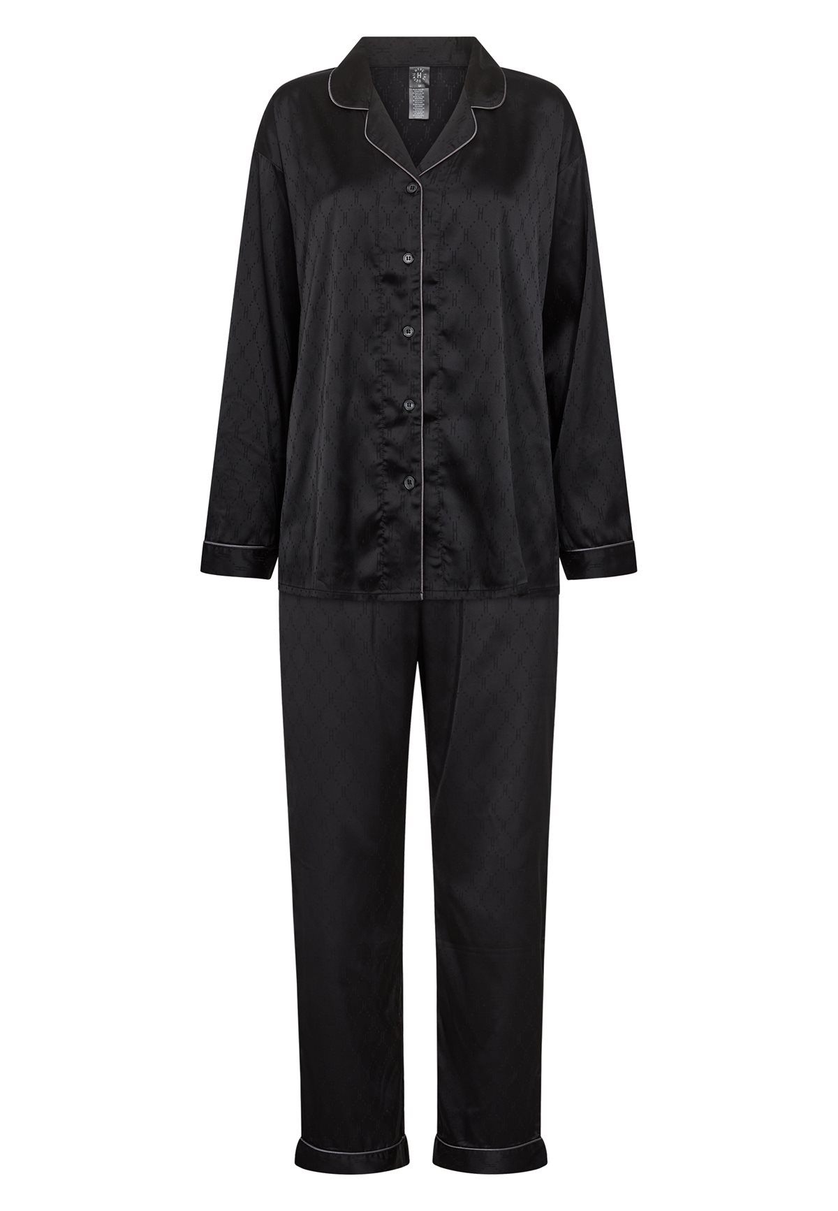 Så lækkert 2 delt pyjamassæt fra Hype The Detail i satinkvalitet i sort med logoskrift. Satin Pyjamas er bestående af bukser med elastikkant i taljen, lommer i siderne og løs ben. Skjorten er oversize i pasformen med v-udskæring, krave, lange ærmer og er gennemknappet. Virkelig det lækreste nattøj.