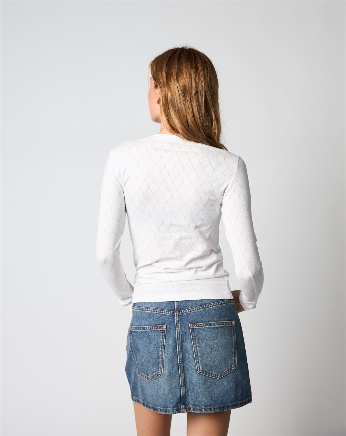 Vi har glædet os til at kunne tilbyde denne virkelig fine basis bluse / langærmet t-shirt fra Hype The Detail. Her i farven hvid og fås også i brun og sort, hvis det bliver en keeper i dit klædskab. Tee L/S H-Logo er lavet i en lækker bomuldkvalitet 65% med et mix af polyester og 5% elastane, som giver t-shirten en blød kvalitet, men som samtidig har godt med stræk i sig, som er med til at holde formen. Det er en tyndere kvalitet med små see-through H-logoer, og er den perfekte bluse at bruge under dine overdele eller står også flot for sig selv til f.eks. et par jeans. Vi vil kalde denne et musthave i dit skab!