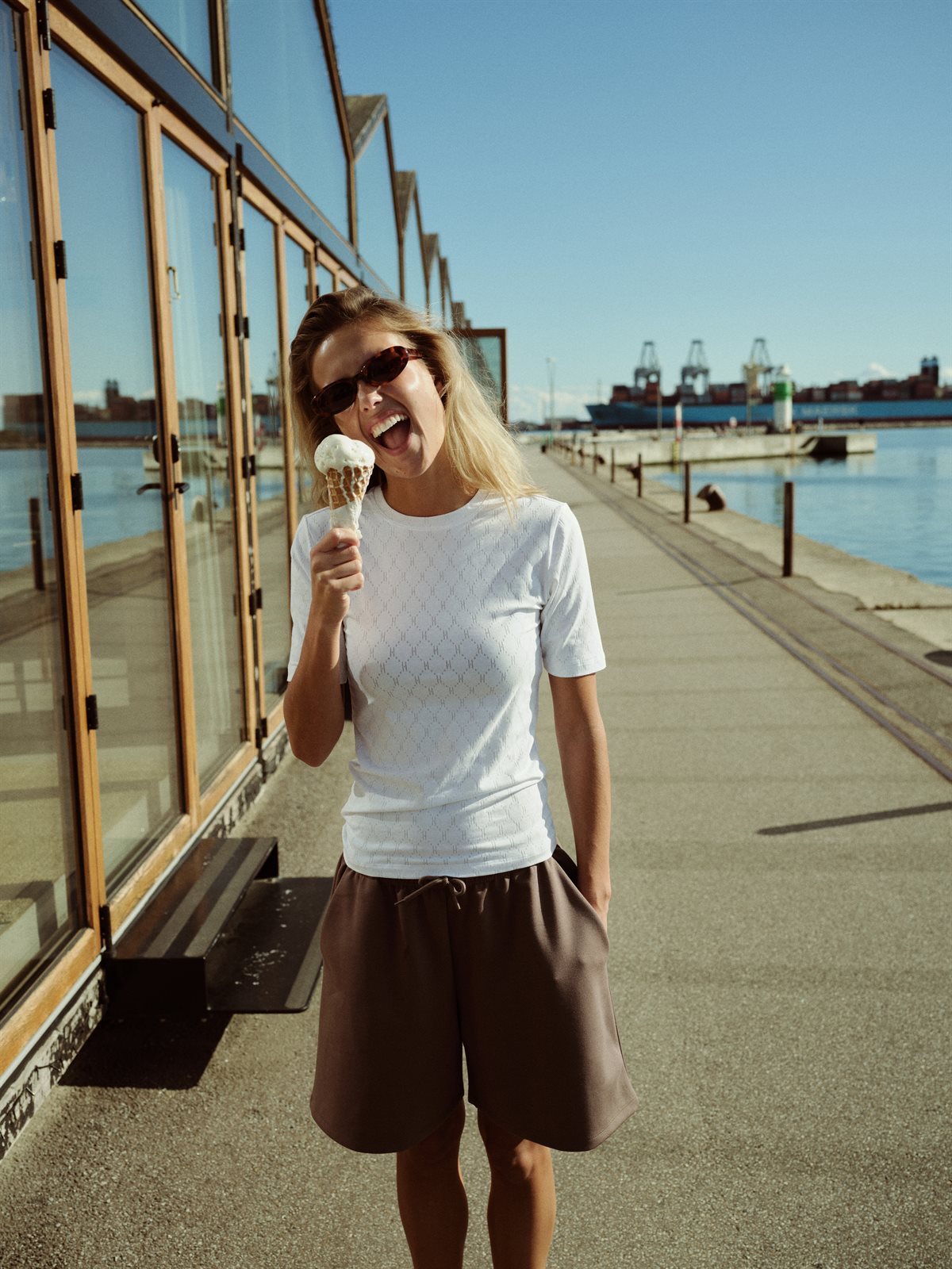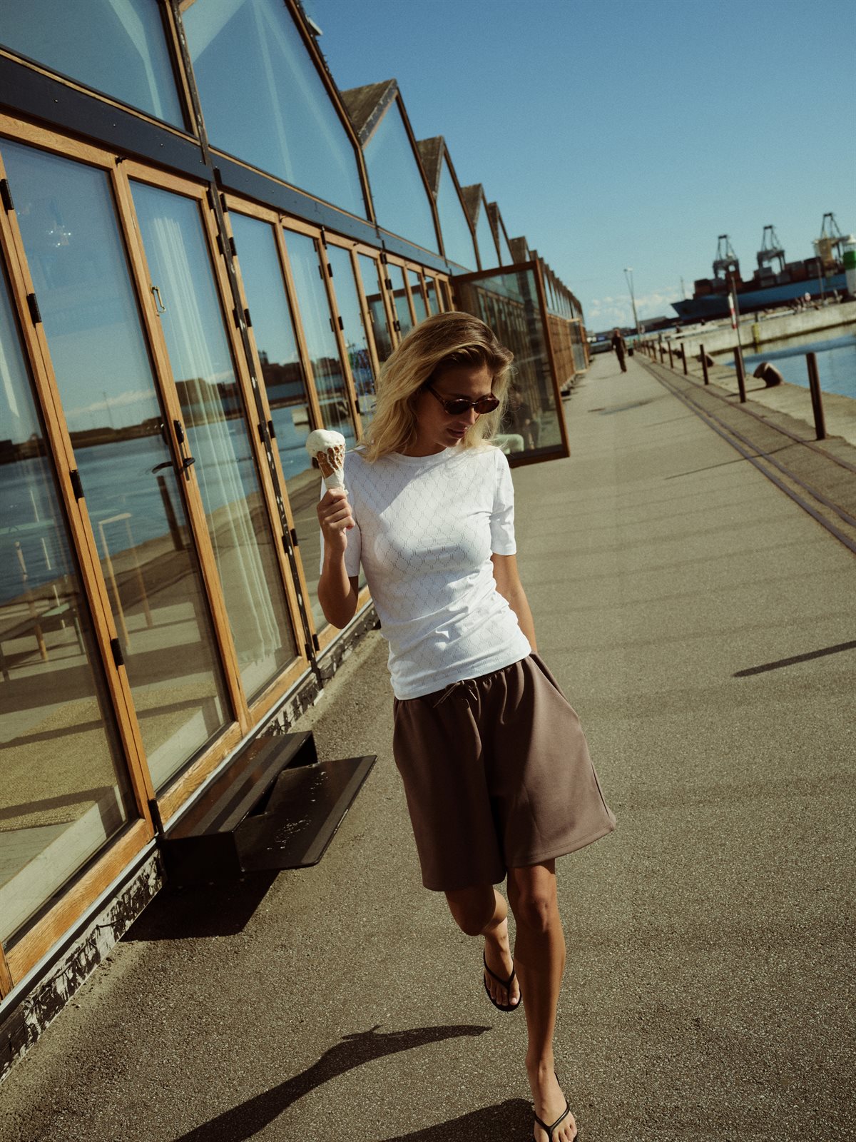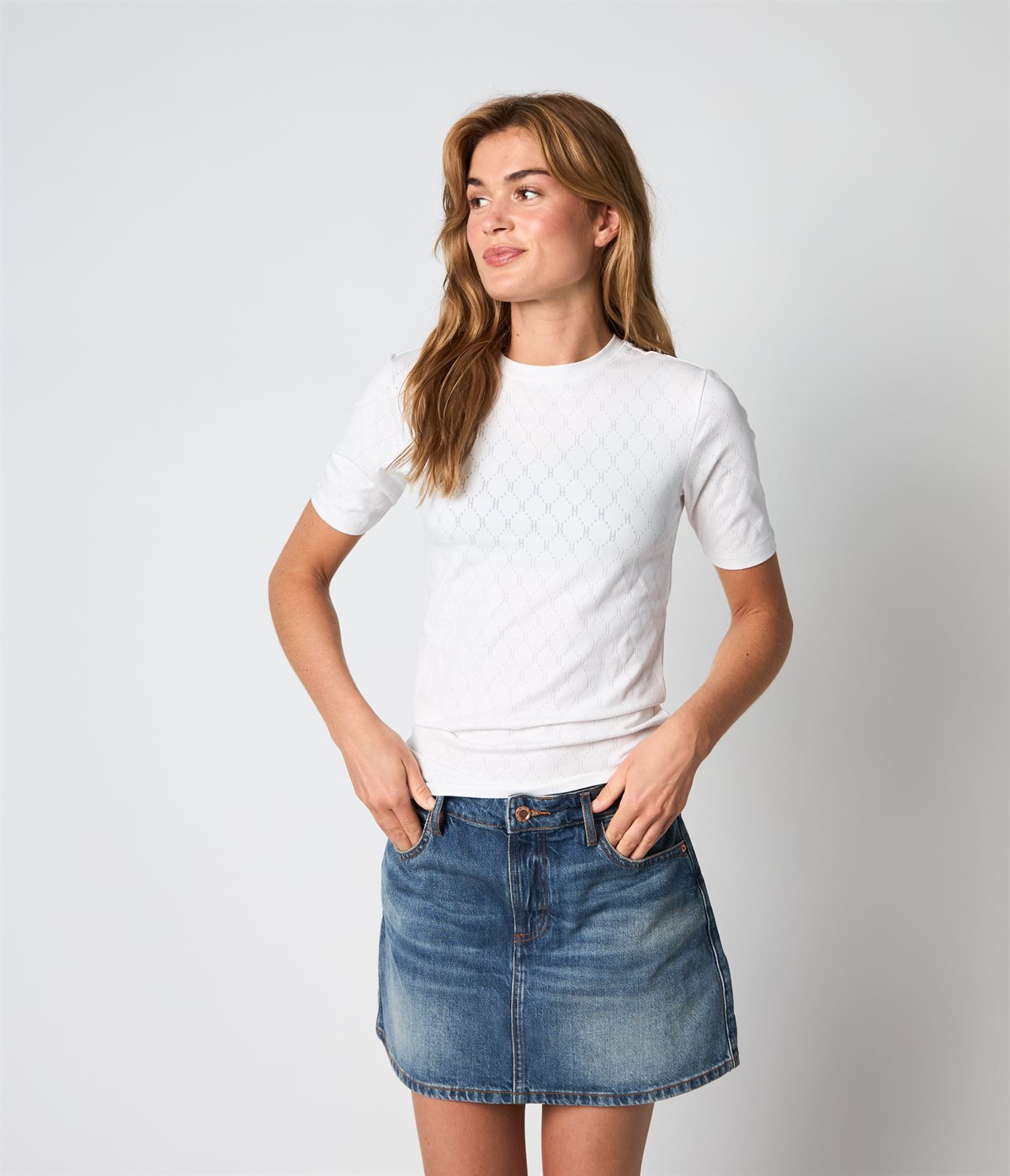 Vi har glædet os til at kunne tilbyde denne virkelig fine basis t-shirt fra Hype The Detail. Her i hvid og fås også i sort og brun, hvis det bliver en keeper i dit klædskab. Tee L/S H-Logo er lavet i en lækker bomuldkvalitet 65% med et mix af polyester og 5% elastane, som giver t-shirten en blød kvalitet, men som samtidig har godt med stræk i sig, som er med til at holde formen. Det er en tyndere kvalitet med små see-through H-logoer, og er den perfekte bluse at bruge under dine overdele eller står også flot for sig selv til f.eks. et par jeans. Vi vil kalde denne et musthave i dit skab!