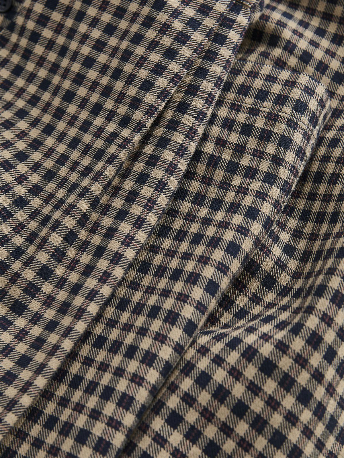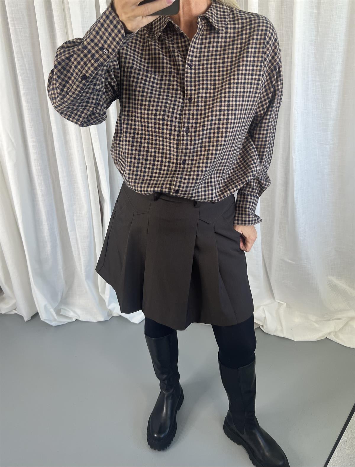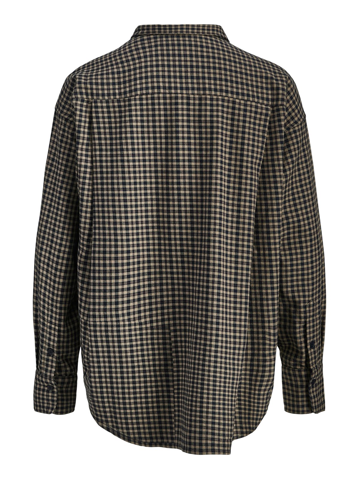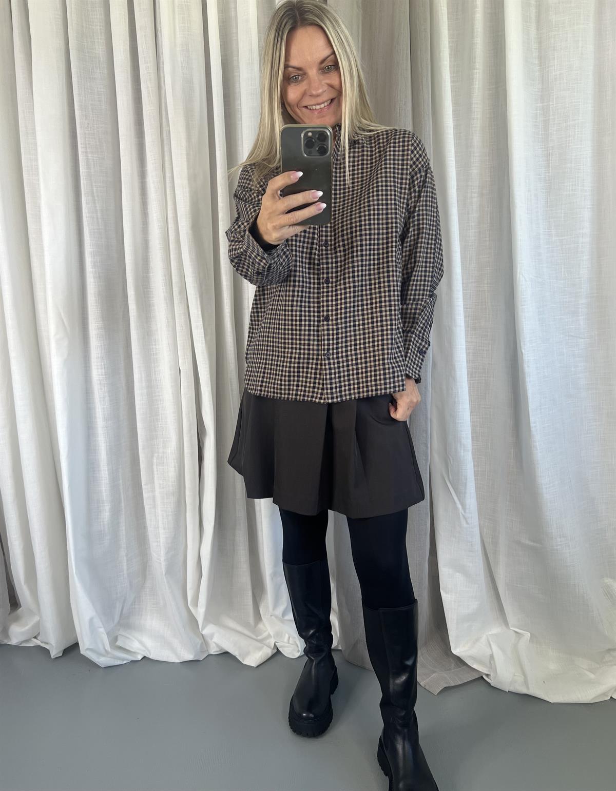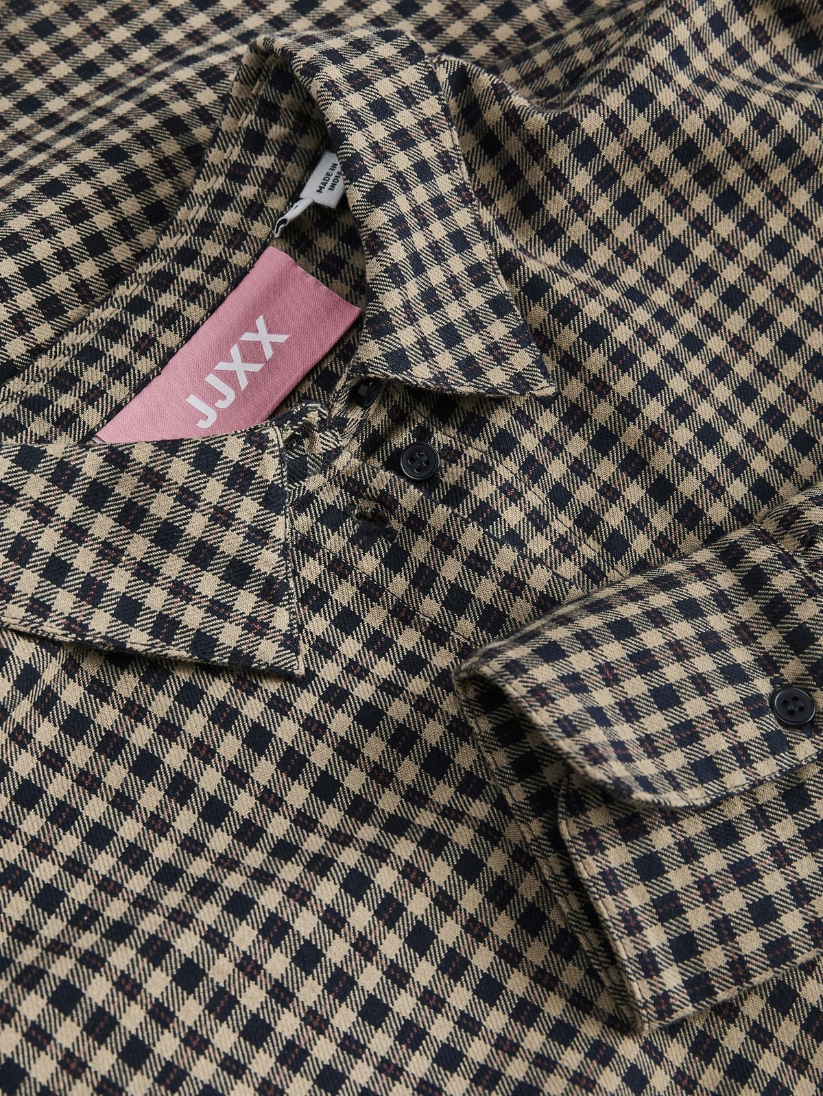 Så lækker blød ternet skjorte i flonel kvalitet fra JJXX. Jamie Check Flannel LS Shirt er gennemknappet, har skjortekrave, og en brystlomme samt lange ærmer med knaplukning ved håndled. Skjorten er med små tern i farvene mørk navyblå (hedder black, men er blå), lysbrun og rust. Skjorten er med en god længde, der dækker numsen og er lidt længere bagtil end foran. Perfekt at style uden over dine yndlings jeans eller sej til et kort skirt, som vist på billedet. Charlotte har en xs på (og svinger mellem xs og s).