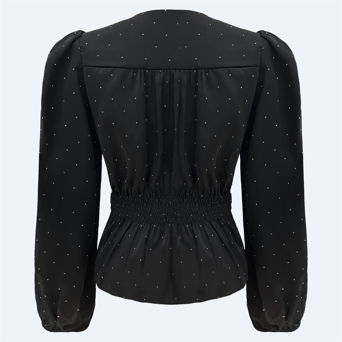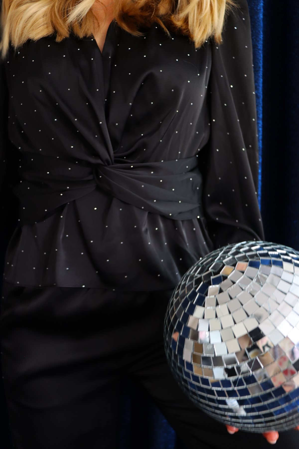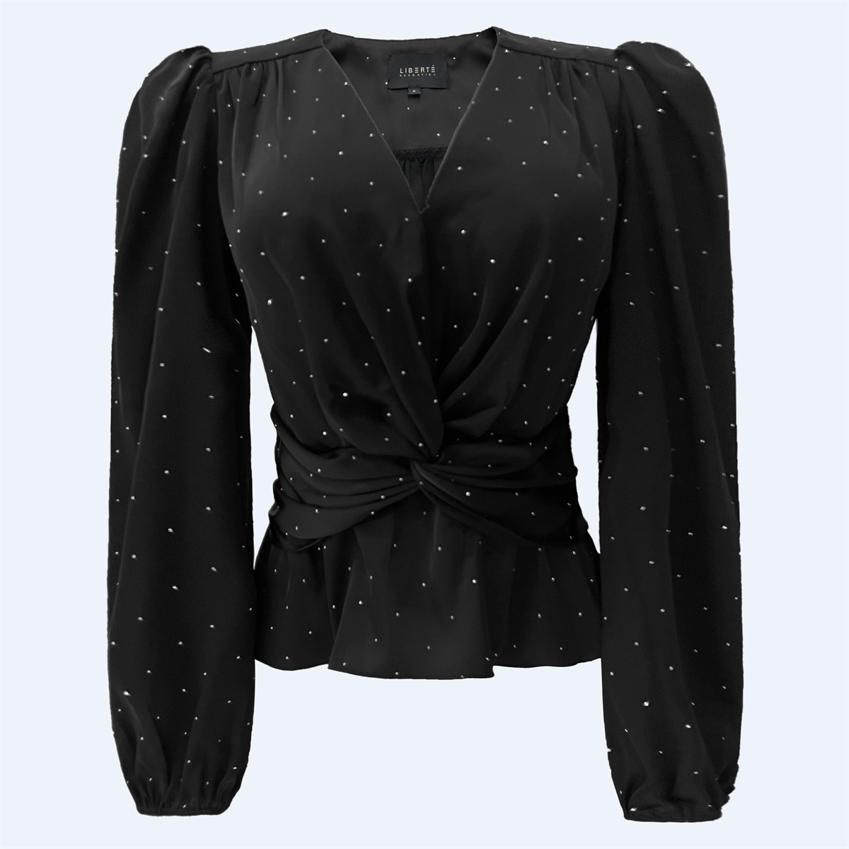 Smukkeste bluse fra Liberté i fin satinkvalitet i sort med små påsatte sten. Tiki Ls Twist Blouse har v-udskæring og den fineste knudeeffekt foran og elastikstykke i ryggen, som giver et fittet og feminint snit. Blusen har desuden lange ærmer med let puf ved skulderpartiet og elastikkant ved håndled. En virkelig elegant og tidløs style, der er oplagt til fest.