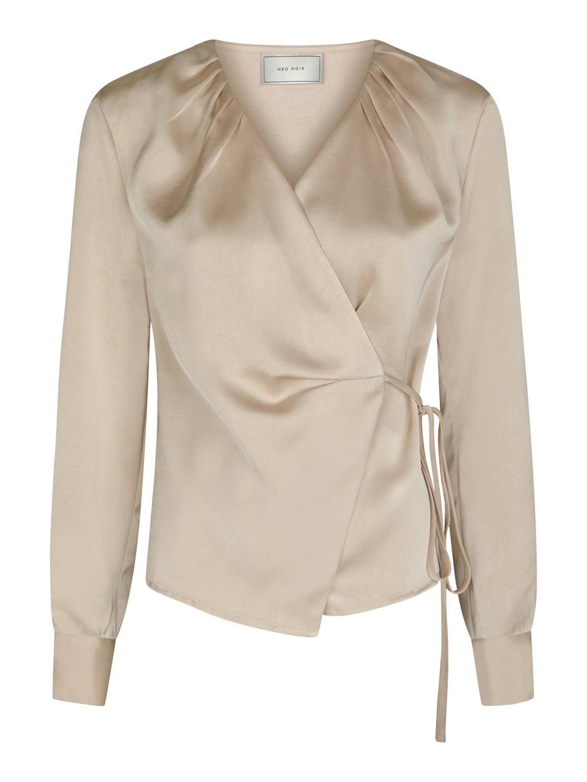 Så elegant og feminin wrapbluse fra Neo Noir i kraftig satinkvalitet i farven champagne. Caprina Heavy Sateen Blouse er med smuk v-udskæring med fin lægdetalje ved halsen. Blusen lukkes med bindebånd i den ende side. Har smukke løse ærmer, som lukkes med knaplukning ved manchetterne. Virkelig en smuk og elegant bluse, som både kan styles til hverdag og til fest.