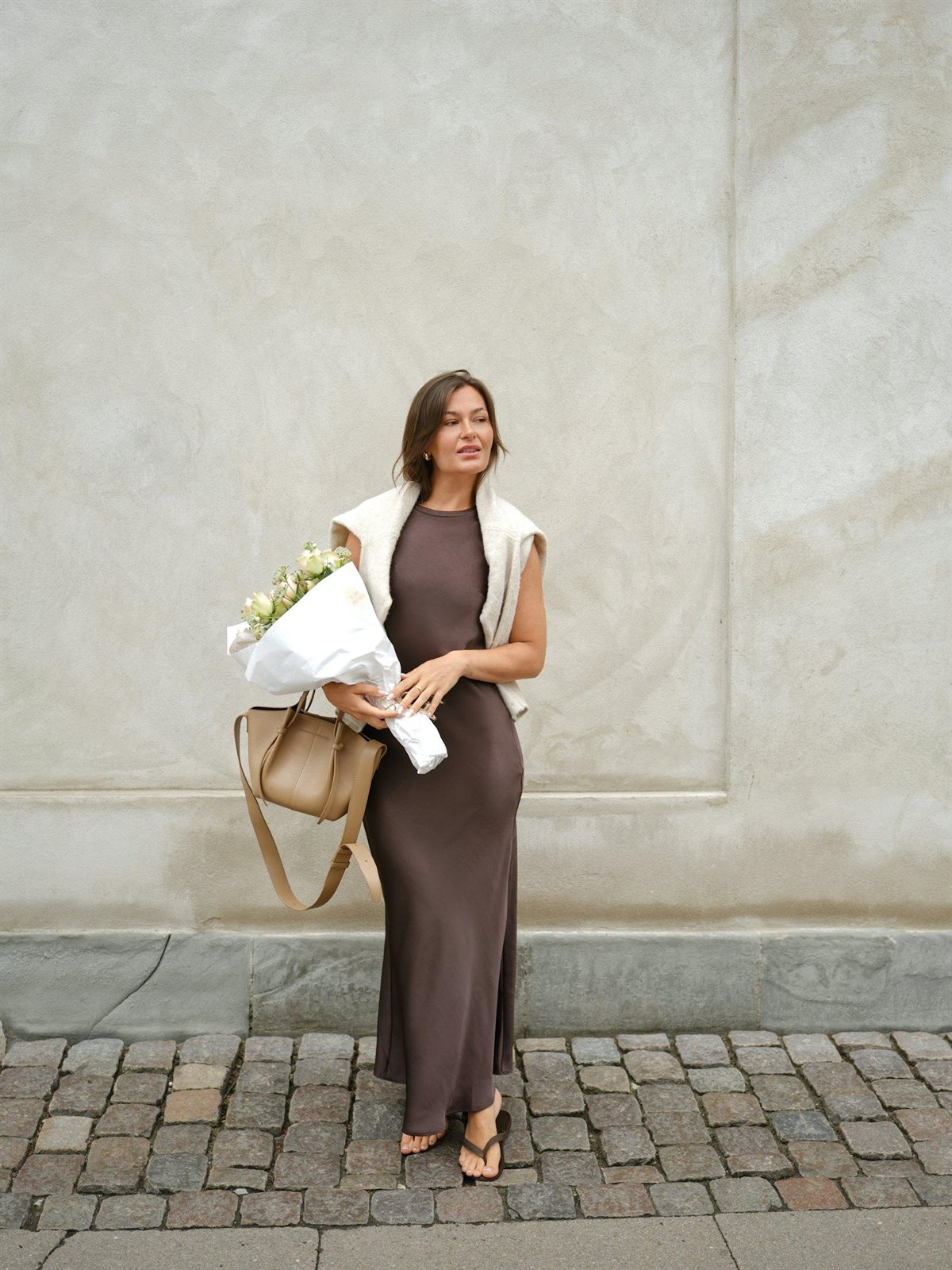 Så smuk ærmeløs sateen kjole i brun fra Neo Noir. Celinie Heavy Sateen Dress er syet en en tung sateen, som gør den falder utrolig smukt. Kjolen sidder til foroven og går derefter ud i havfrue effekt. Den har rund halsudskæring, skær et godt stykke inde ved skulderen. På ryggen lukkes den med en lille knap og lynlås i siden.